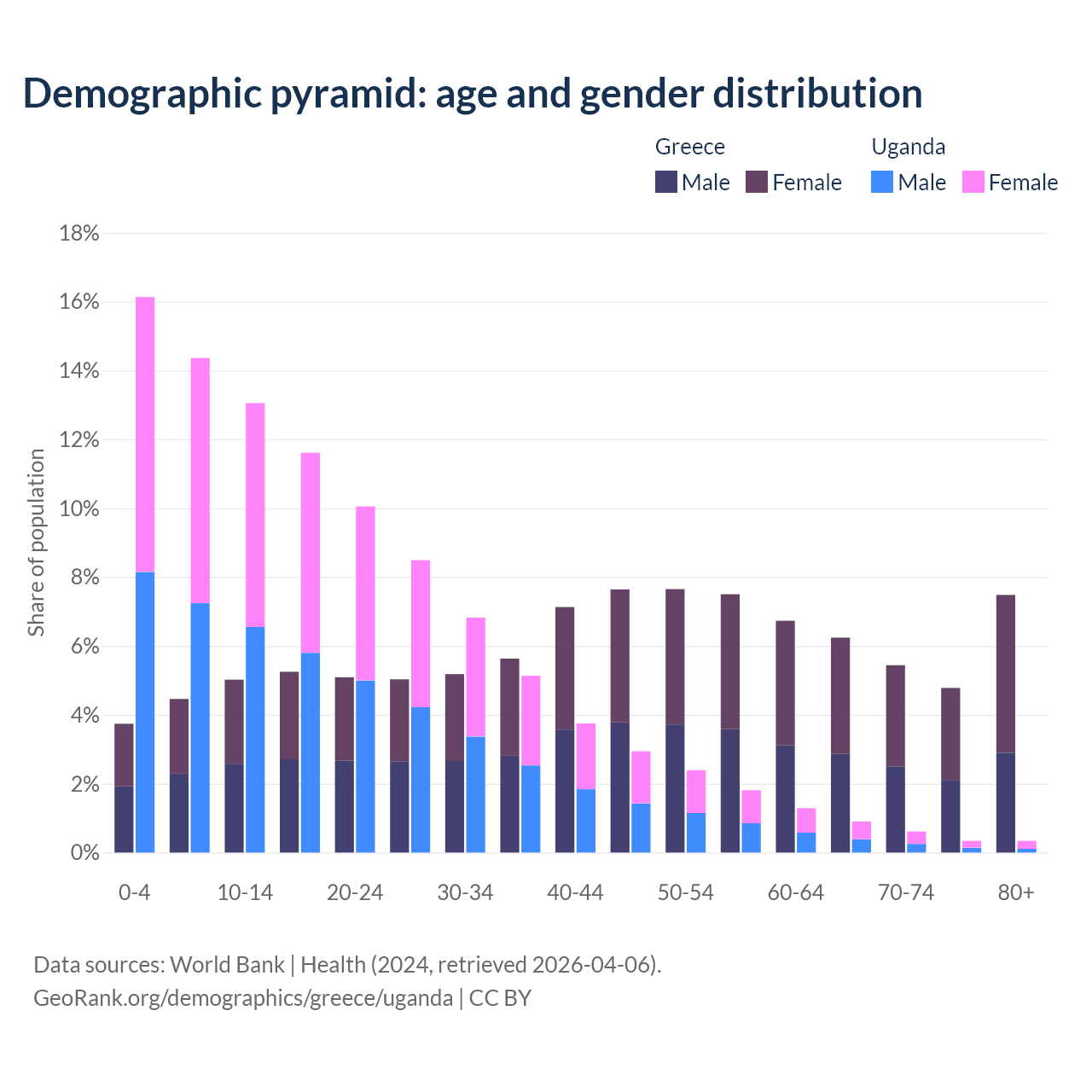 - As of 2026, the population of Greece is 10.2M vs 53.2M in Uganda - 5.22 times difference.
