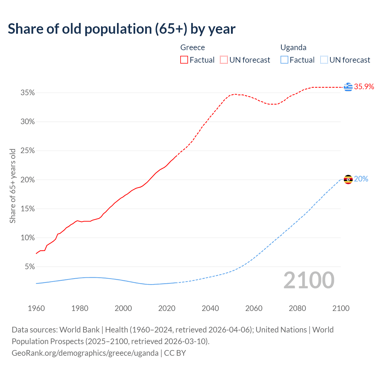 The share of older people aged 65 and over is 23.9% in Greece and 2.19% in Uganda. Life expectancy in Greece compared to Uganda .