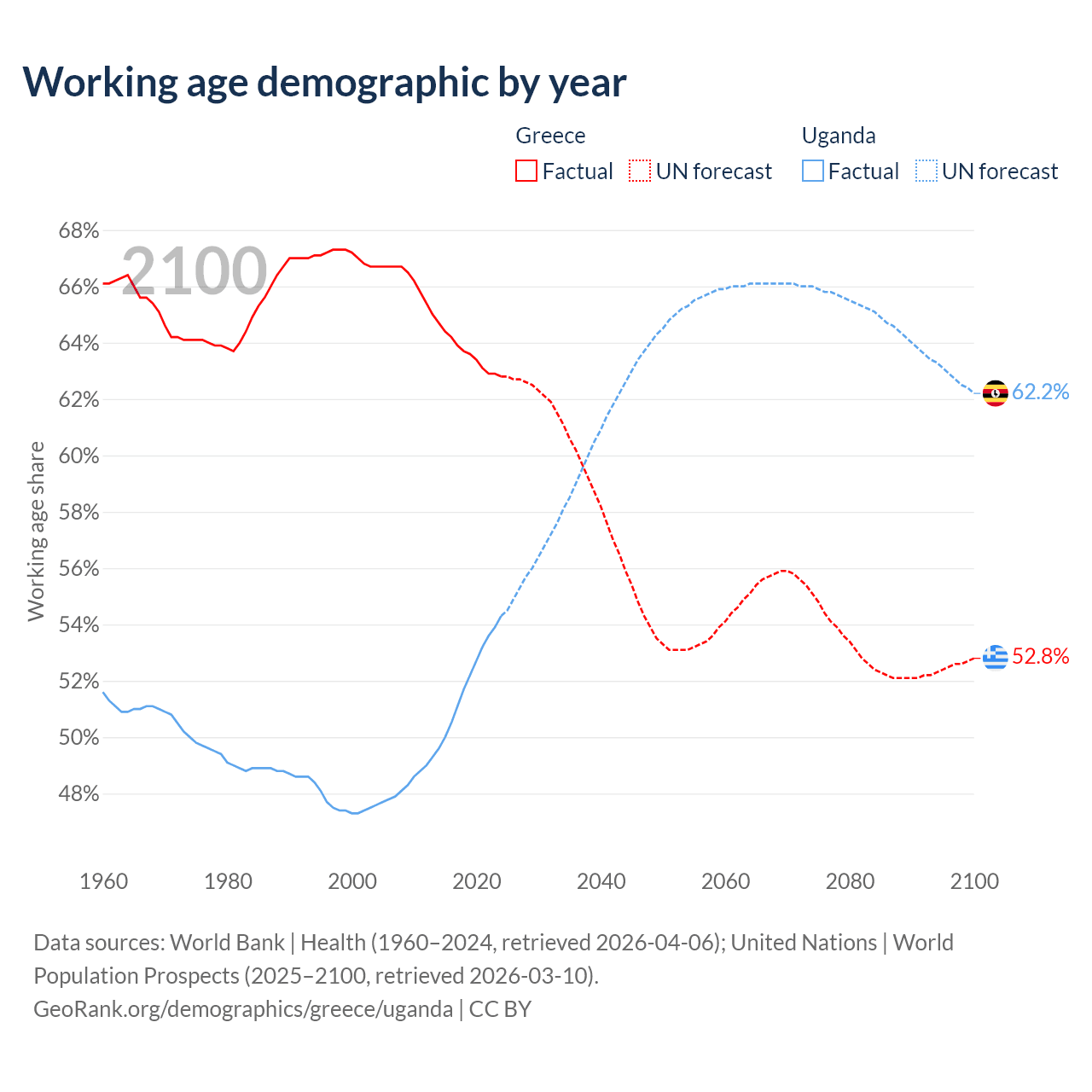 - Greece has 6.4M working age adults (aged 15-64) vs 28.9M in Uganda.