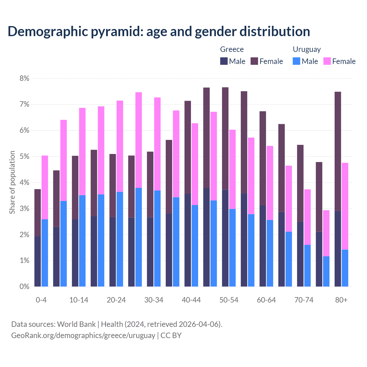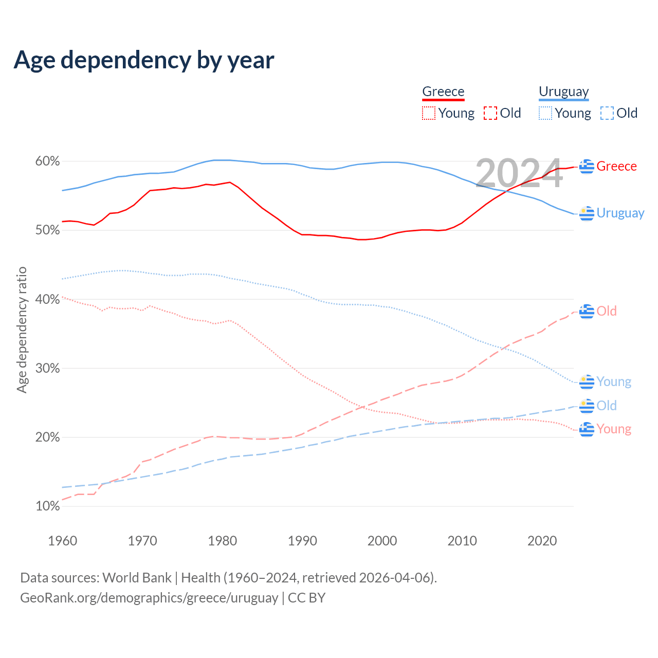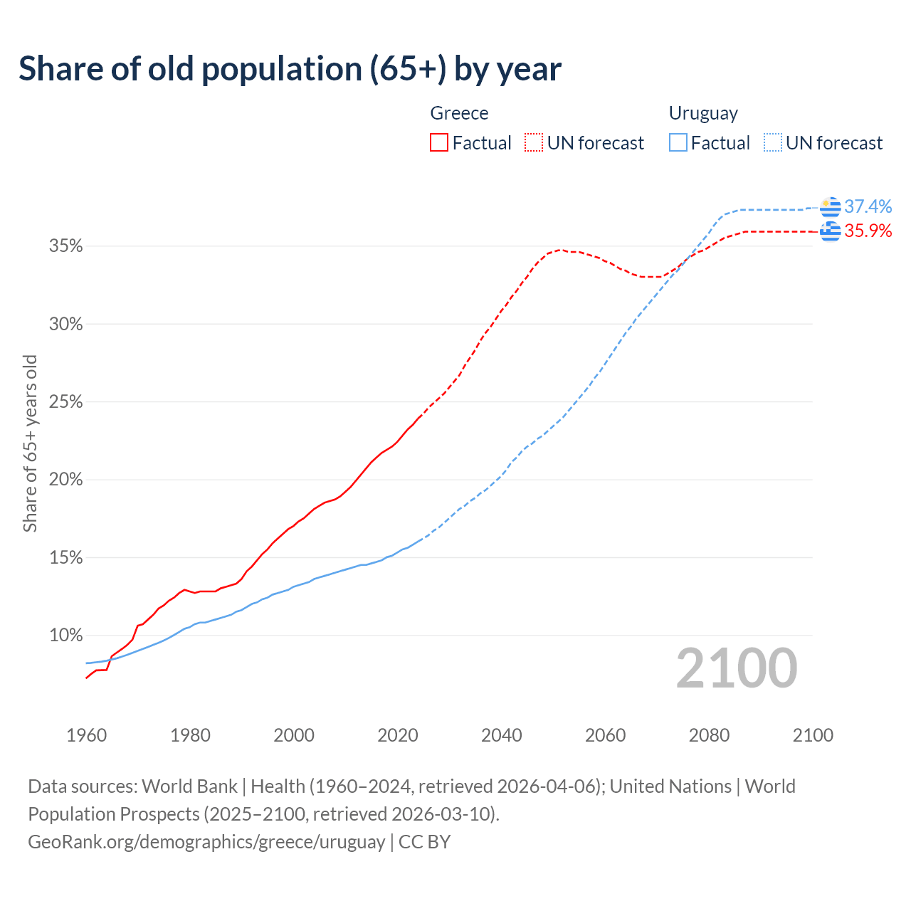 The share of older people aged 65 and over is 23.9% in Greece and 16% in Uruguay. Life expectancy in Greece compared to Uruguay .