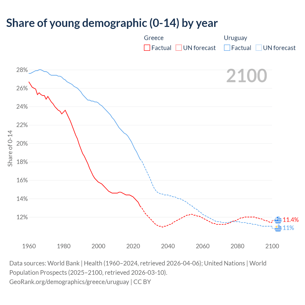 - The share of young demographic (0-15 years old) in Greece is 13.2% vs 18.3% in Uruguay.