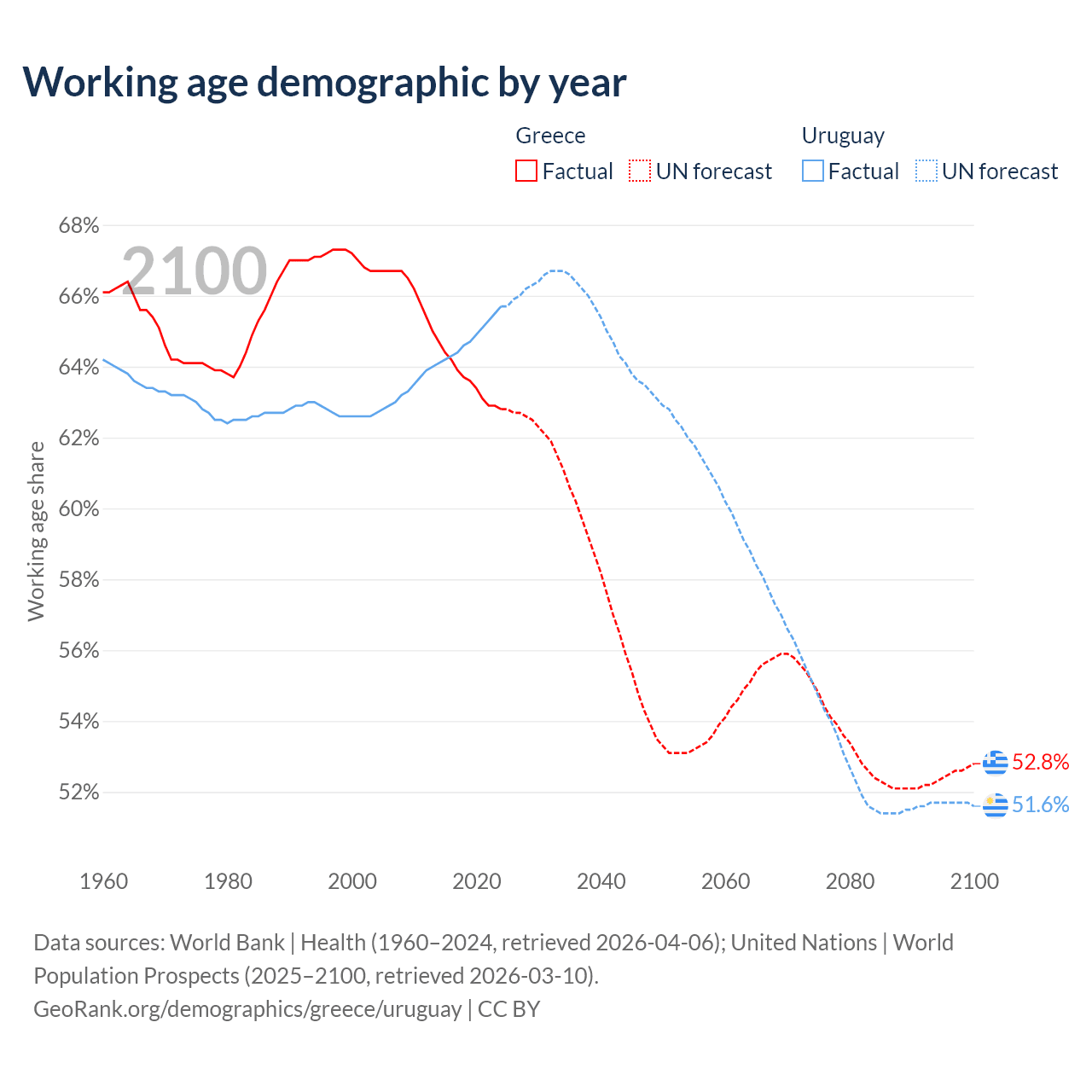 Median age Greece vs Uruguay, 1960-2100