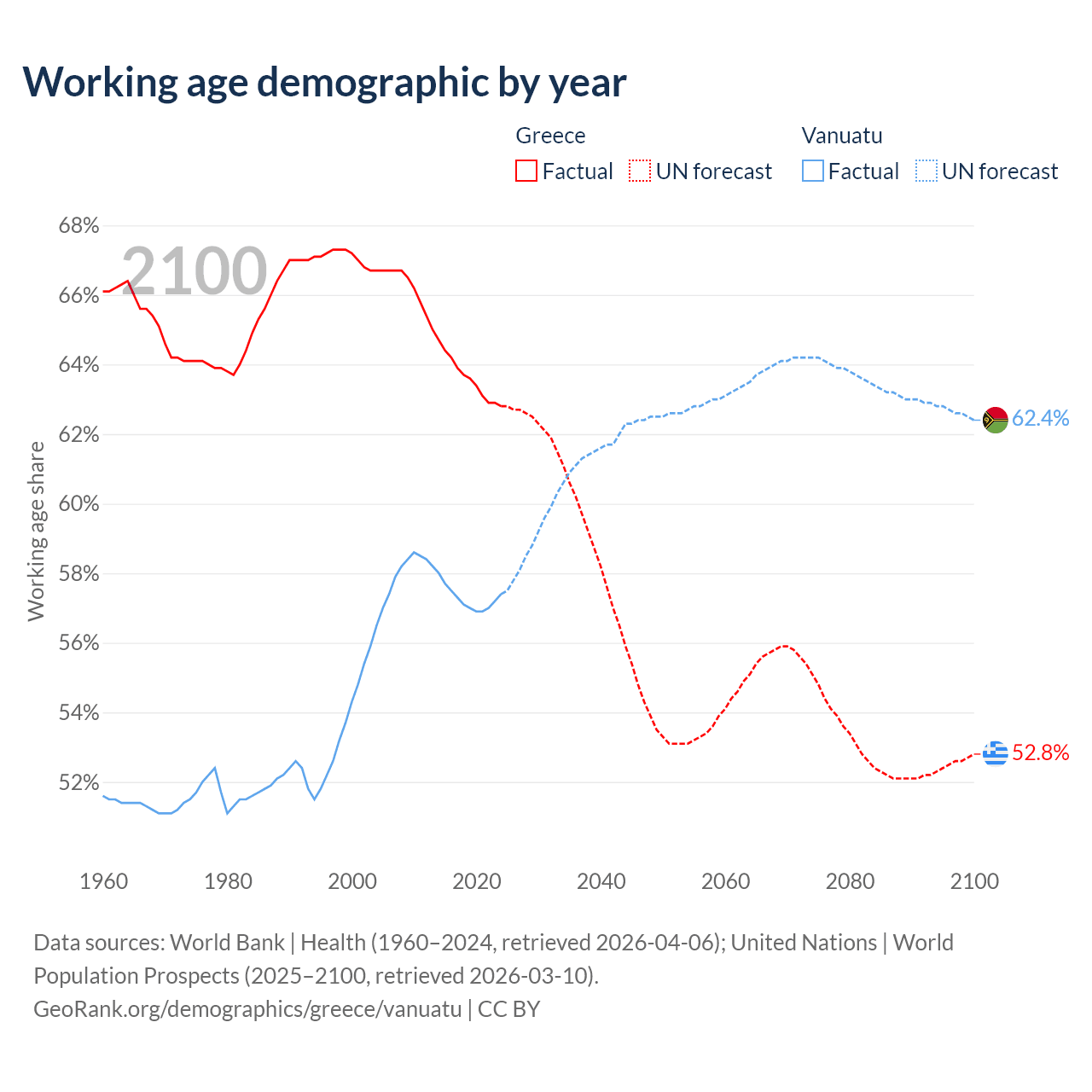 - The share of young demographic (0-15 years old) in Greece is 13.2% vs 38.3% in Vanuatu.