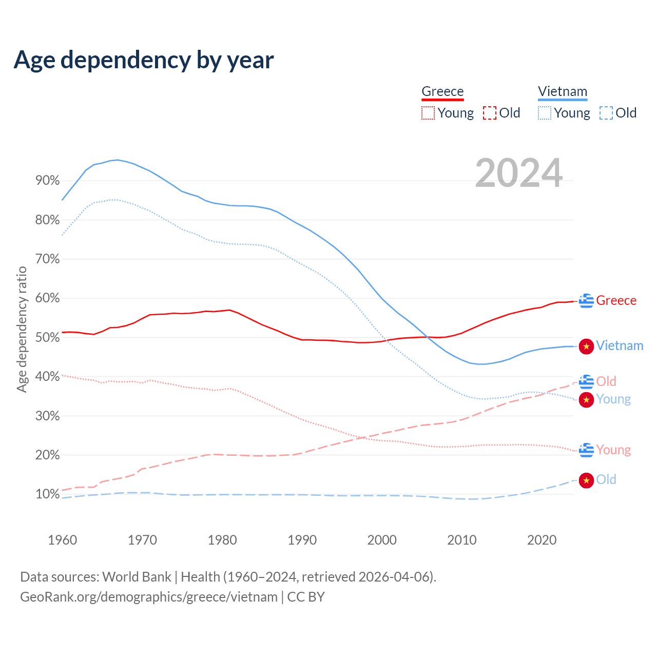 - Greece is ranked 6/196 by median age (oldest to youngest) vs 84/196 for Vietnam.