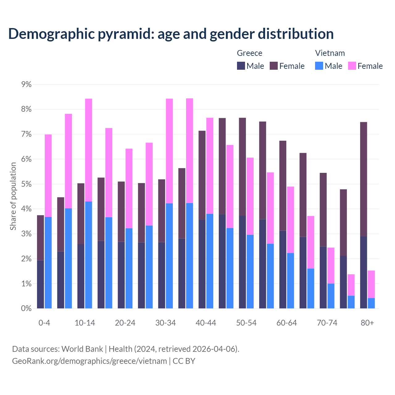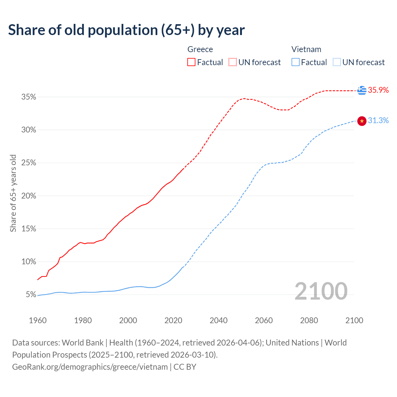 The share of older people aged 65 and over is 23.9% in Greece and 9.05% in Vietnam. Life expectancy in Greece compared to Vietnam .