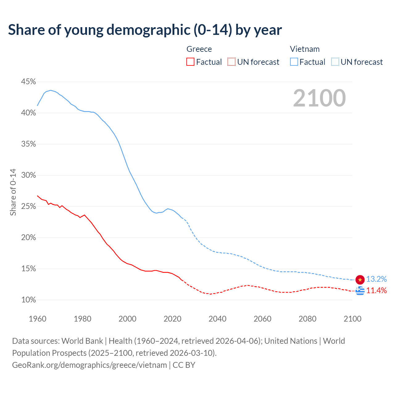 - The share of young demographic (0-15 years old) in Greece is 13.2% vs 23.2% in Vietnam.