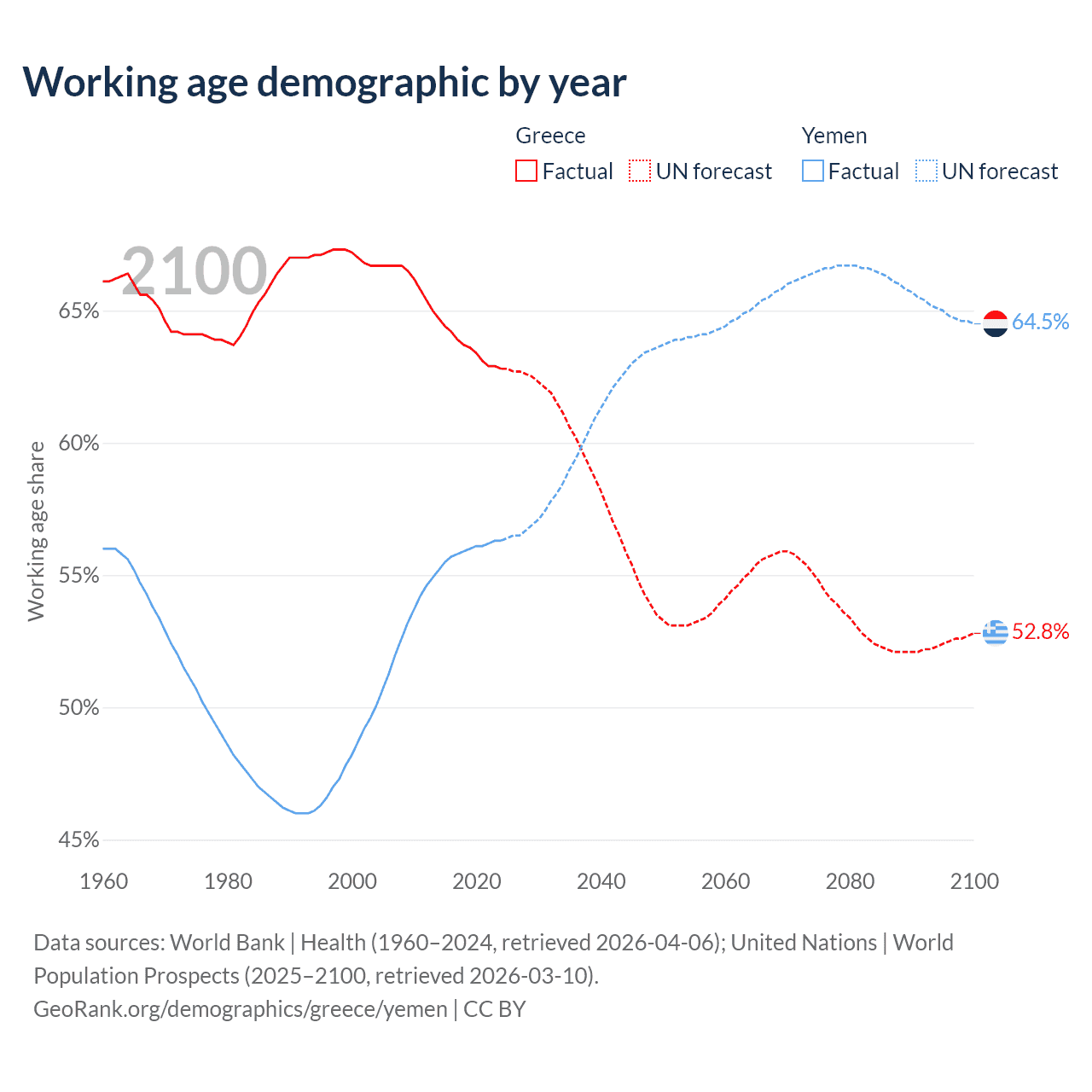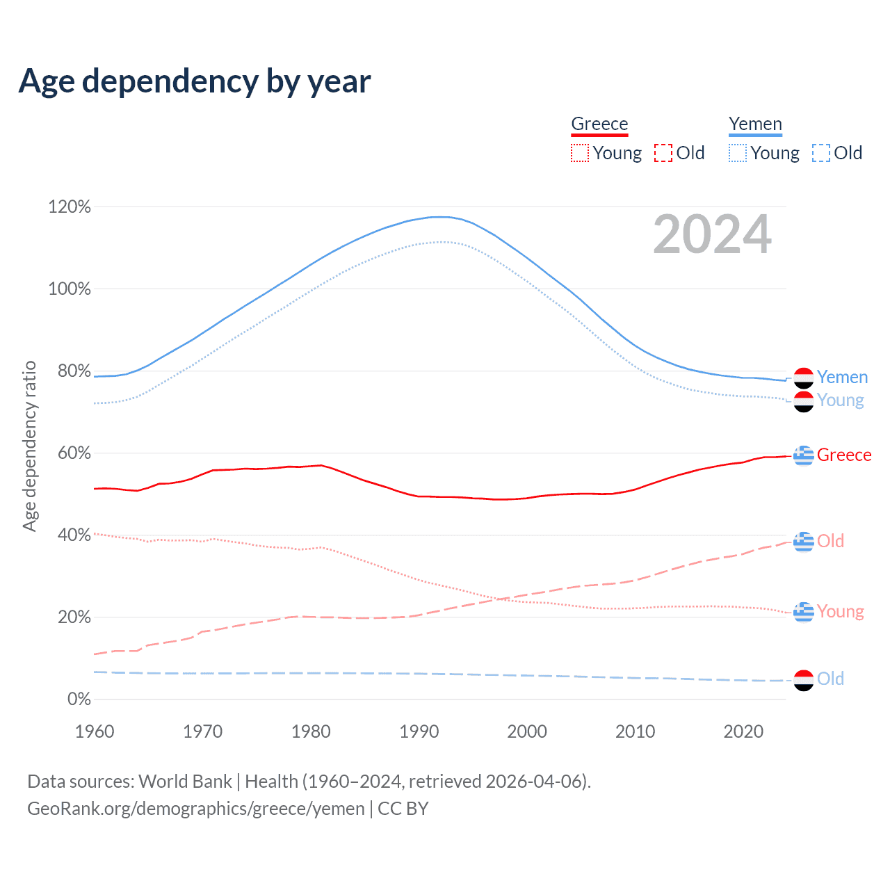 - The share of old-age demographic (65+) in Greece is 23.9% vs 2.52% in Yemen.