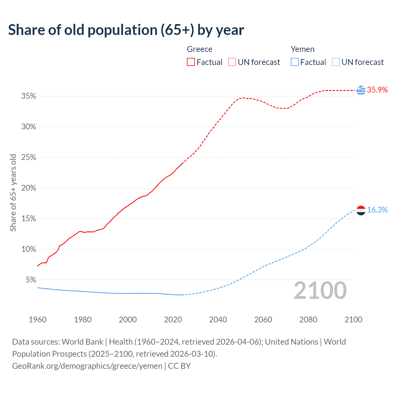 The share of older people aged 65 and over is 23.9% in Greece and 2.52% in Yemen. Life expectancy in Greece compared to Yemen .