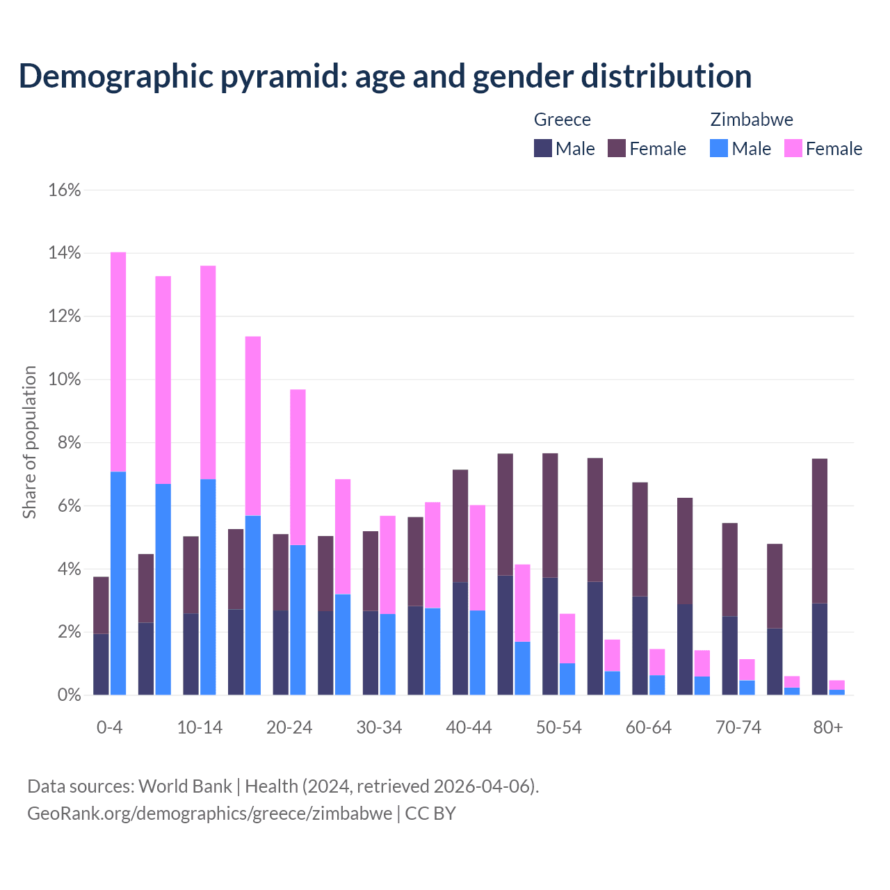- The share of old-age demographic (65+) in Greece is 23.9% vs 3.6% in Zimbabwe.