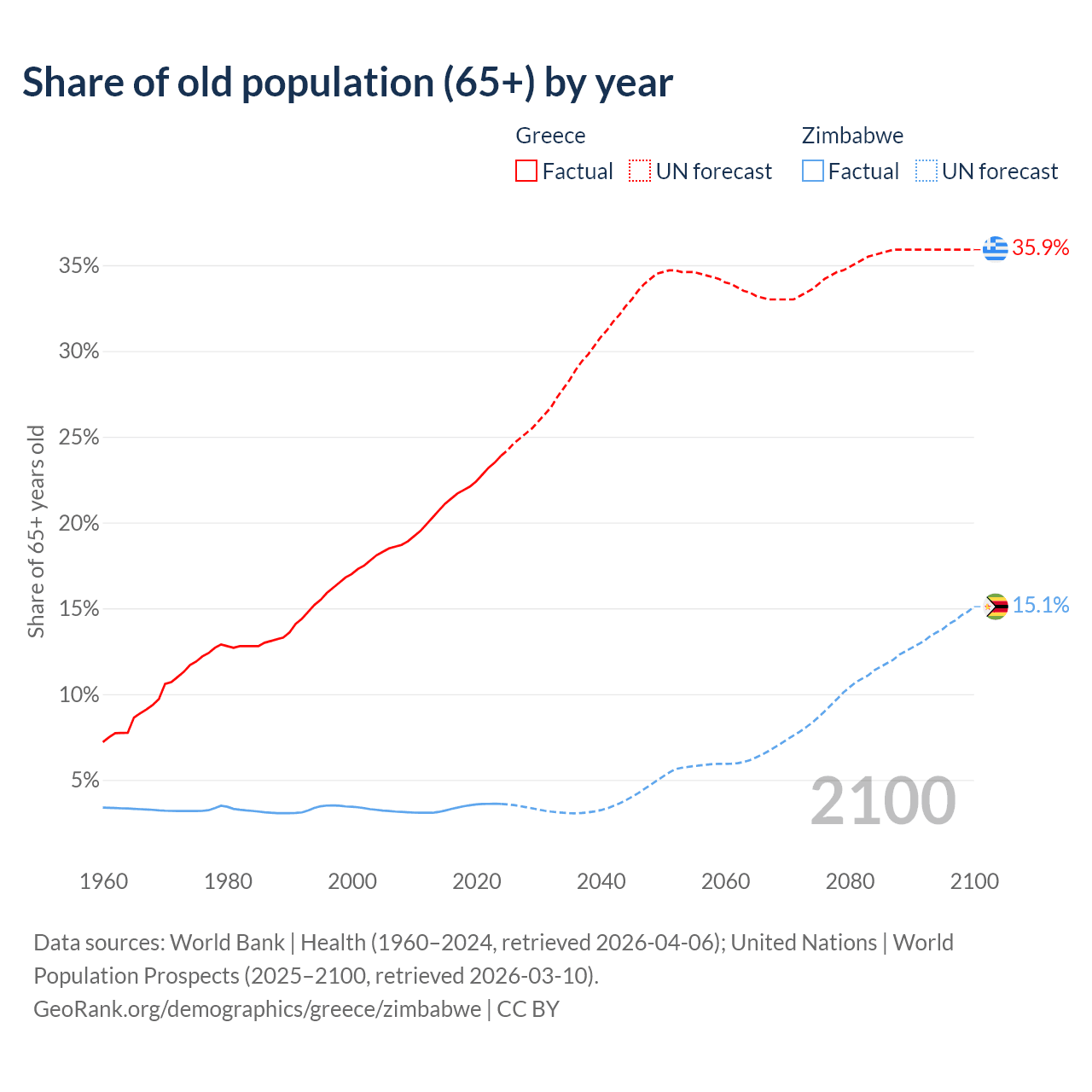 The share of older people aged 65 and over is 23.9% in Greece and 3.6% in Zimbabwe. Life expectancy in Greece compared to Zimbabwe .