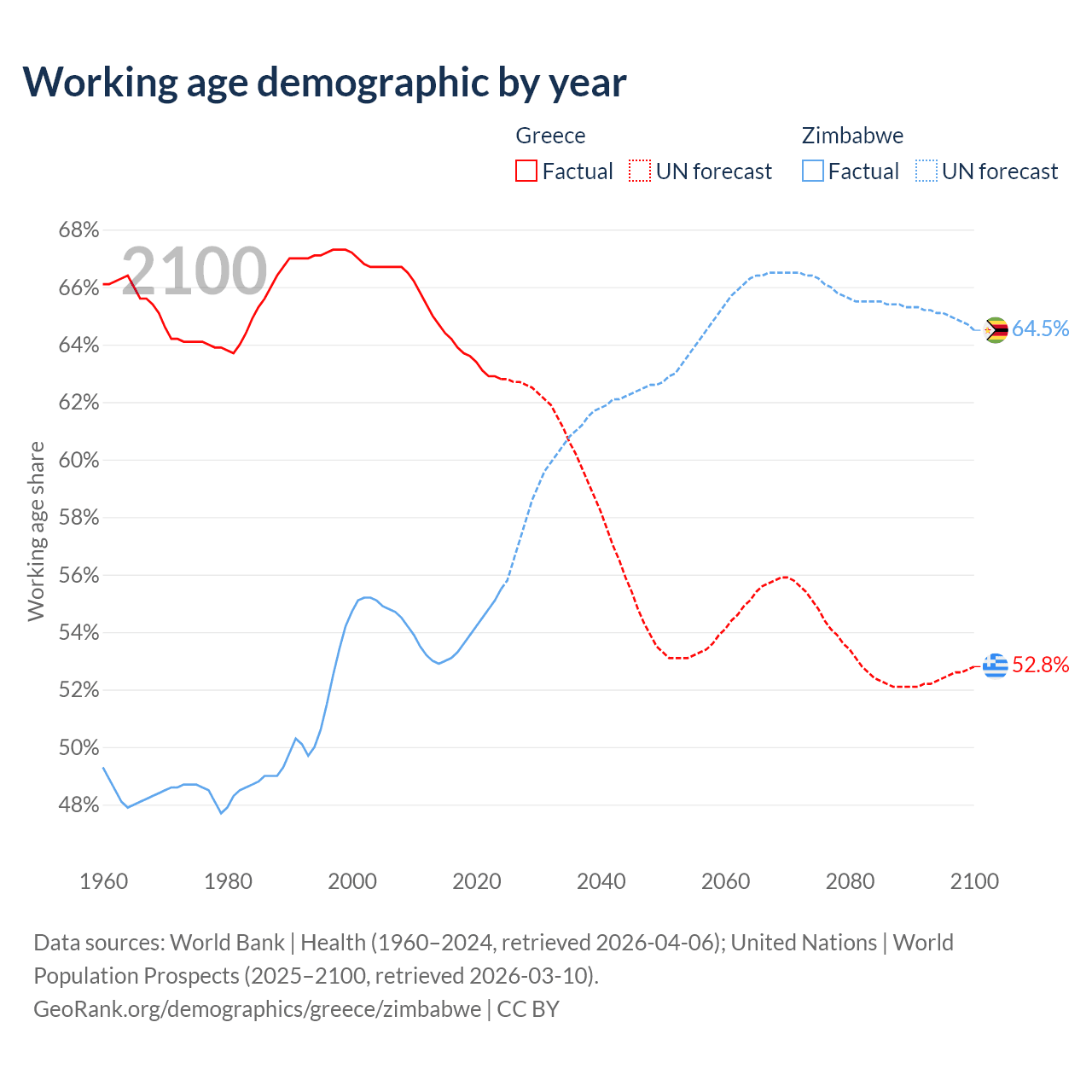 Median age Greece vs Zimbabwe, 1960-2100