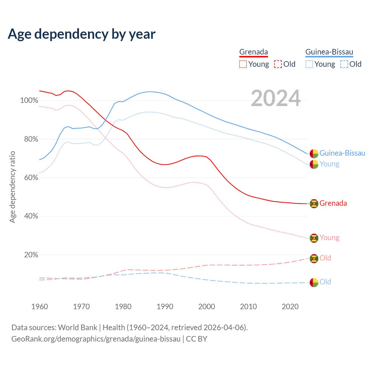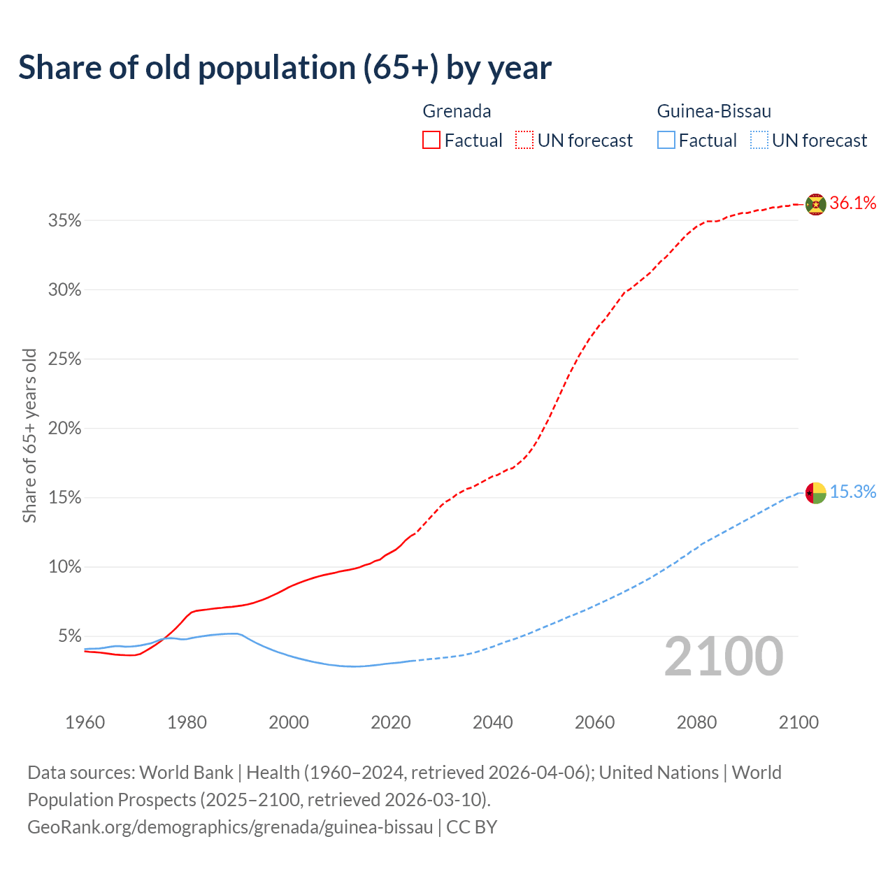 - The share of old-age demographic (65+) in Grenada is 12.2% vs 3.19% in Guinea-Bissau.