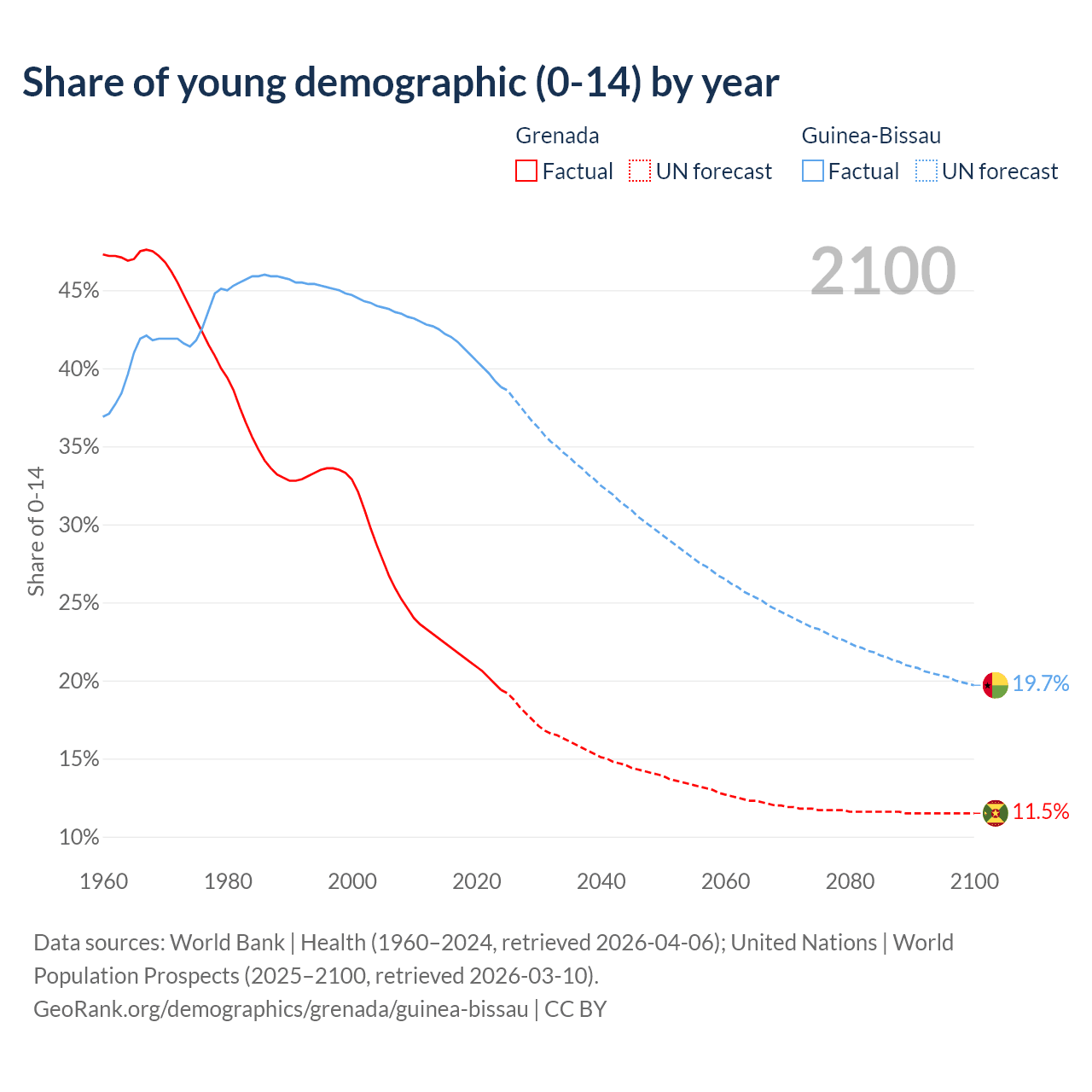 - The share of young demographic (0-15 years old) in Grenada is 19.4% vs 38.8% in Guinea-Bissau.