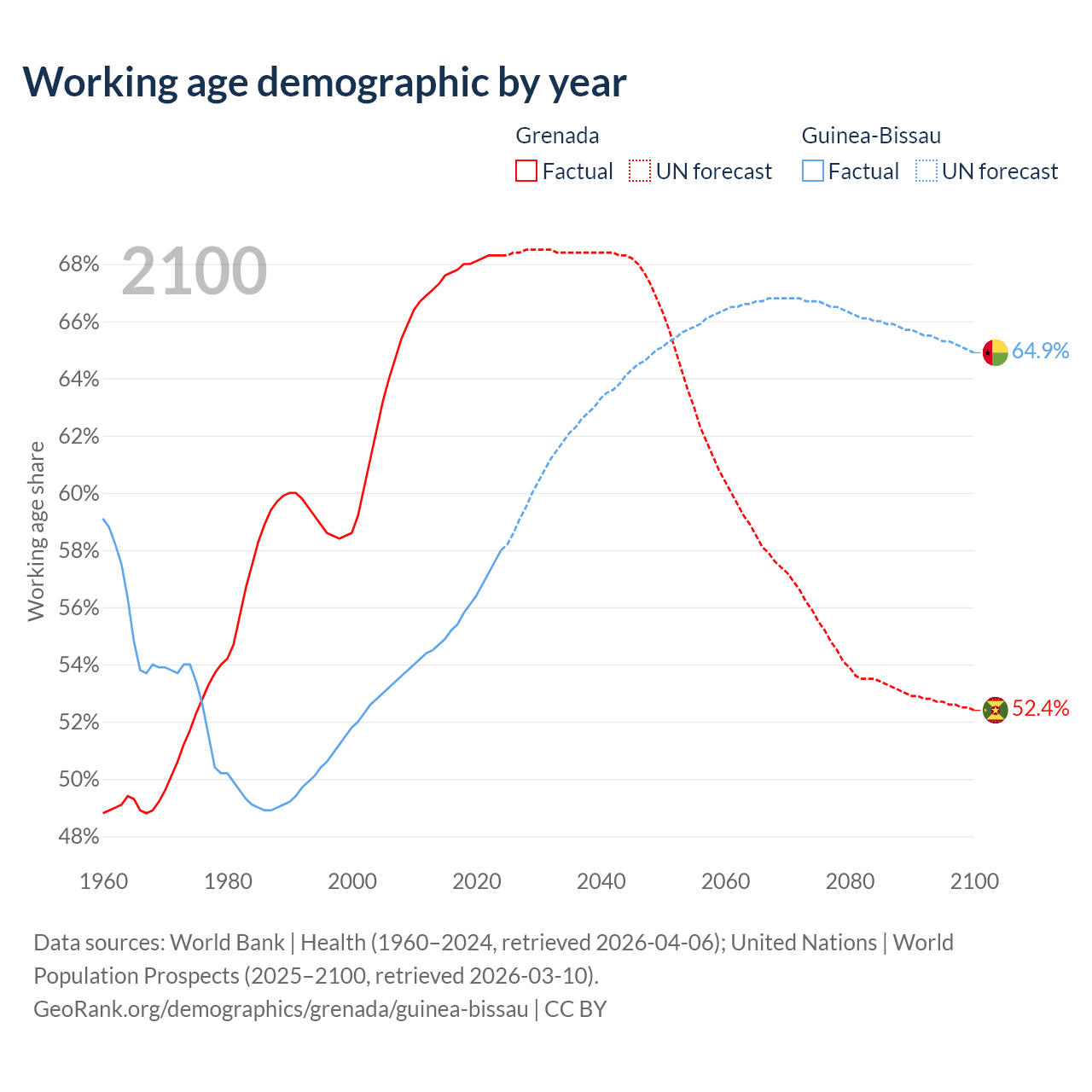 - Grenada has 80.2K working age adults (aged 15-64) vs 1.34M in Guinea-Bissau.