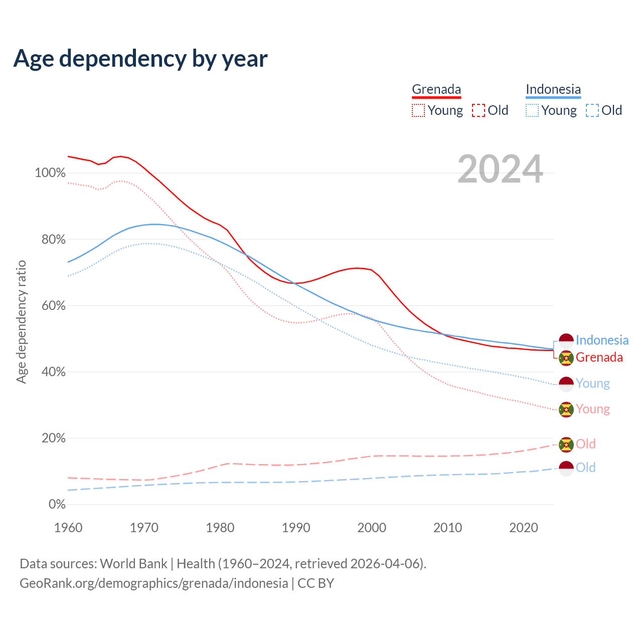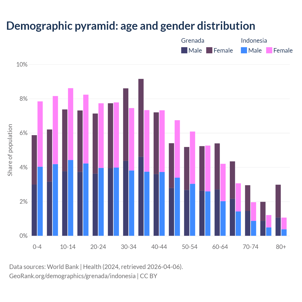 - Grenada is ranked 77/196 by median age (oldest to youngest) vs 93/196 for Indonesia.