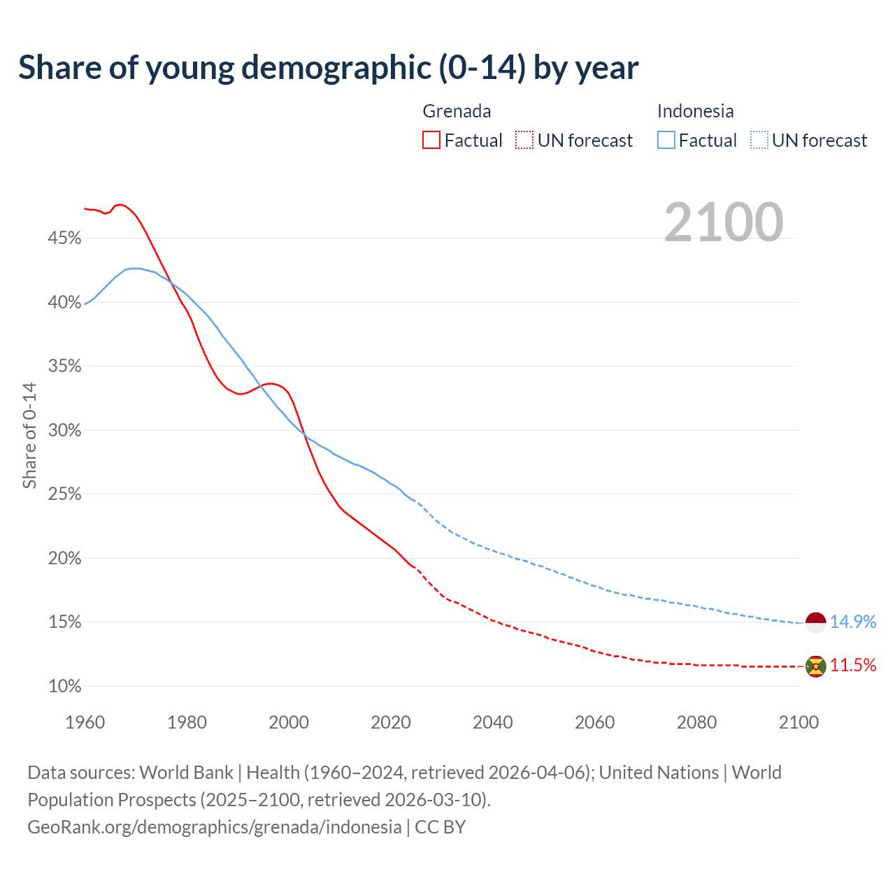- The share of young demographic (0-15 years old) in Grenada is 19.4% vs 24.6% in Indonesia.