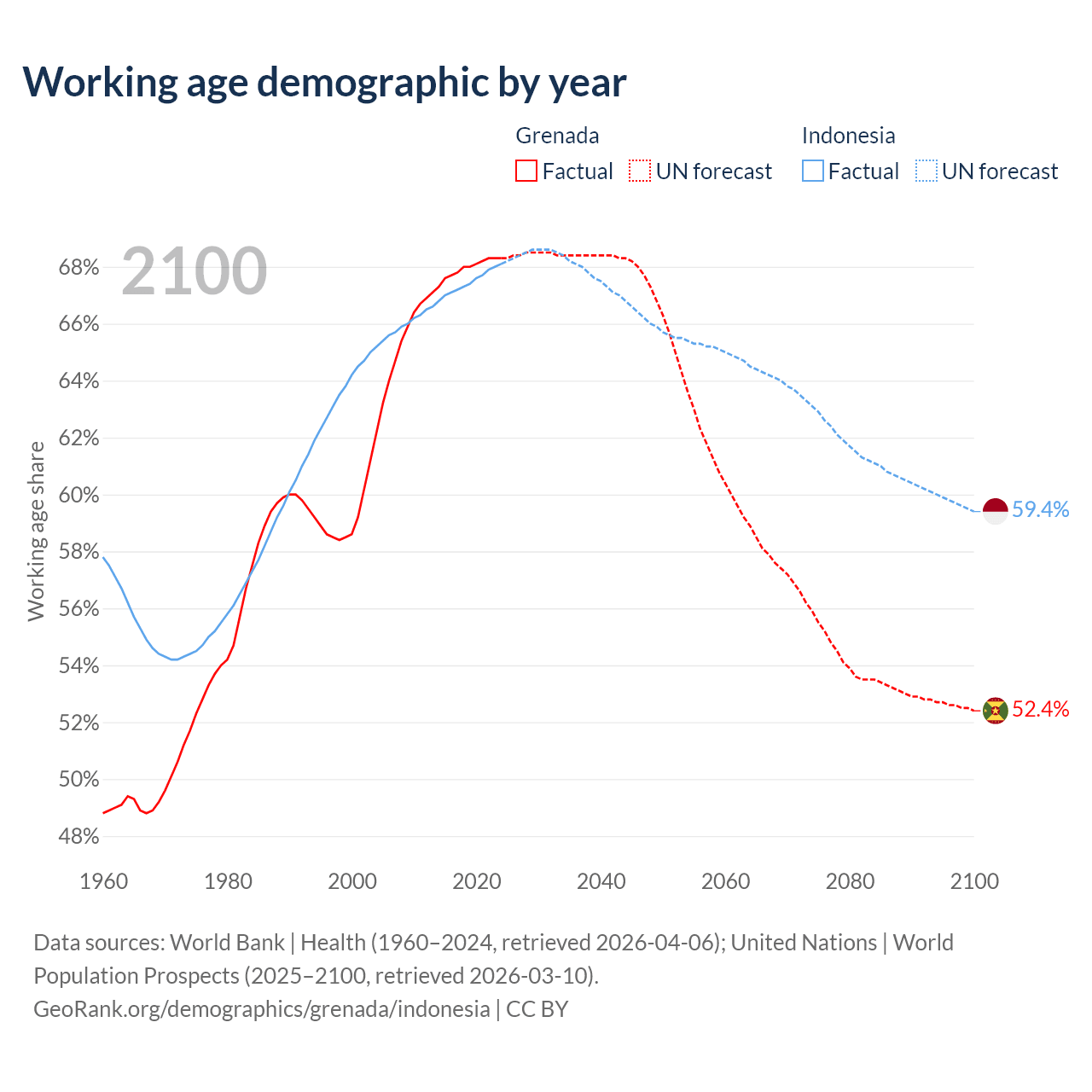 - Grenada has 80.2K working age adults (aged 15-64) vs 197M in Indonesia.