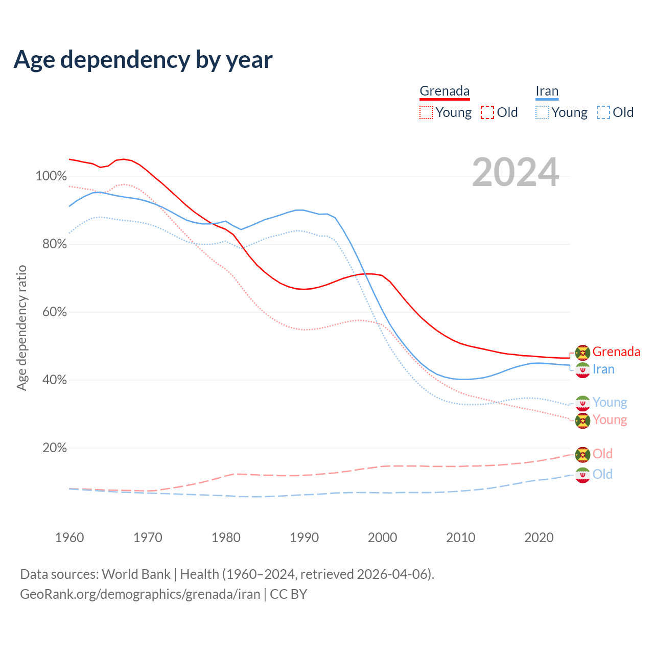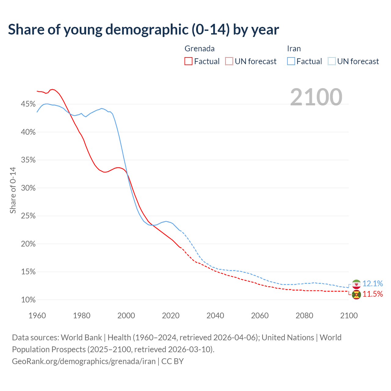 - The share of young demographic (0-15 years old) in Grenada is 19.4% vs 22.4% in Iran.