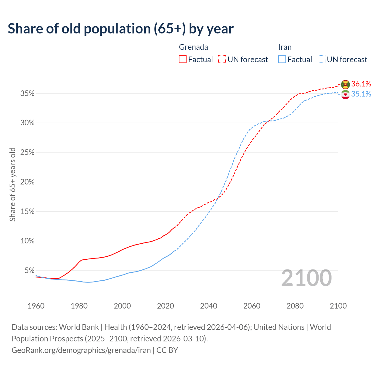 - The share of old-age demographic (65+) in Grenada is 12.2% vs 8.24% in Iran.