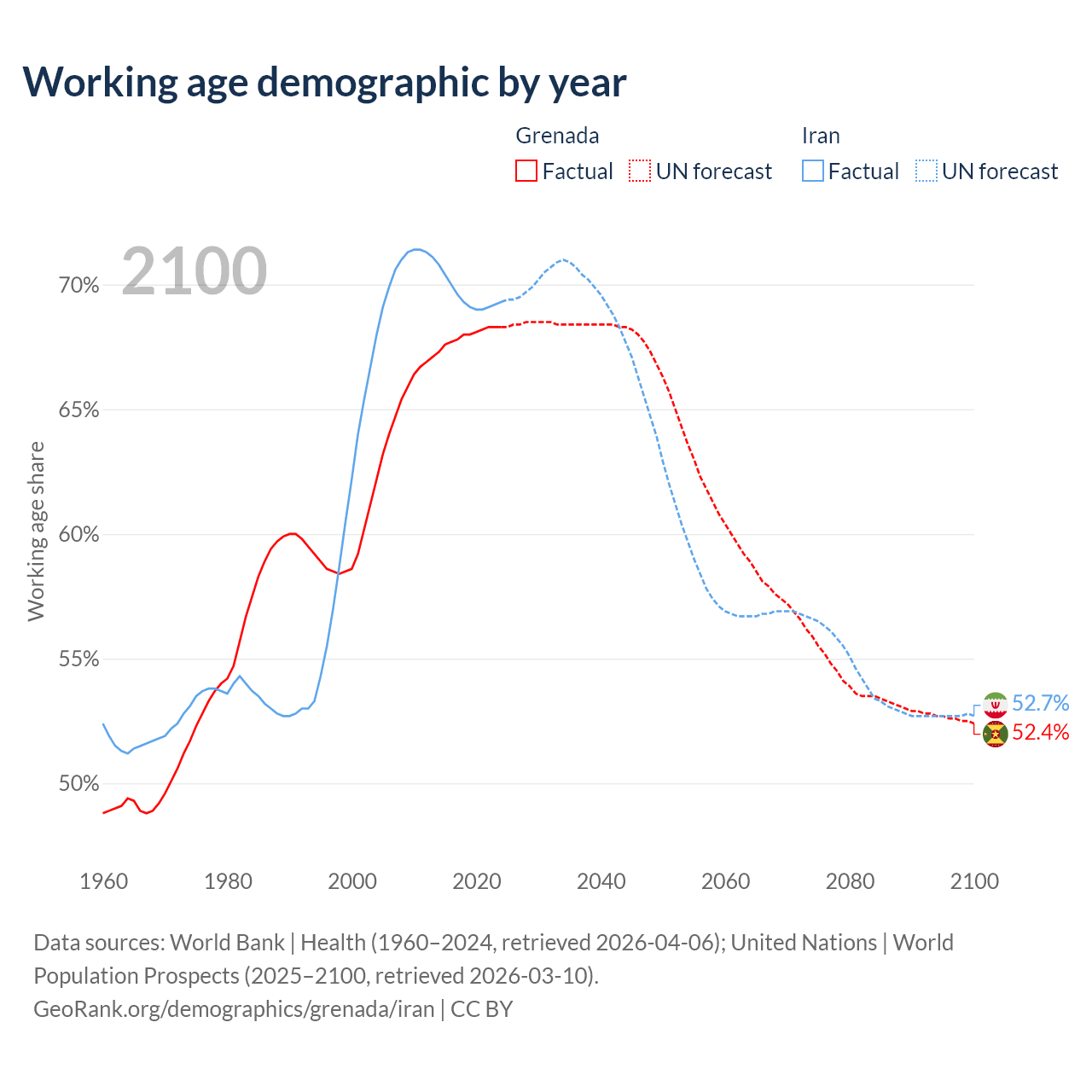 - Grenada has 80.2K working age adults (aged 15-64) vs 64.8M in Iran.