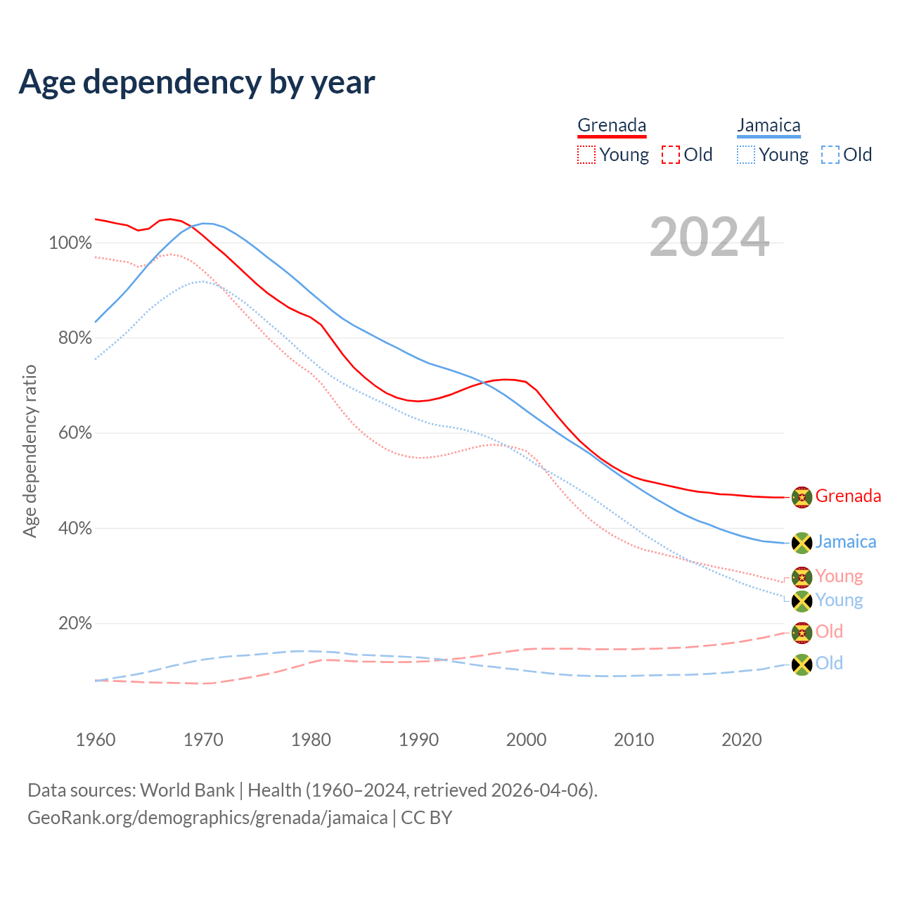The share of older people aged 65 and over is 12.2% in Grenada and 8.21% in Jamaica. Life expectancy in Grenada compared to Jamaica .