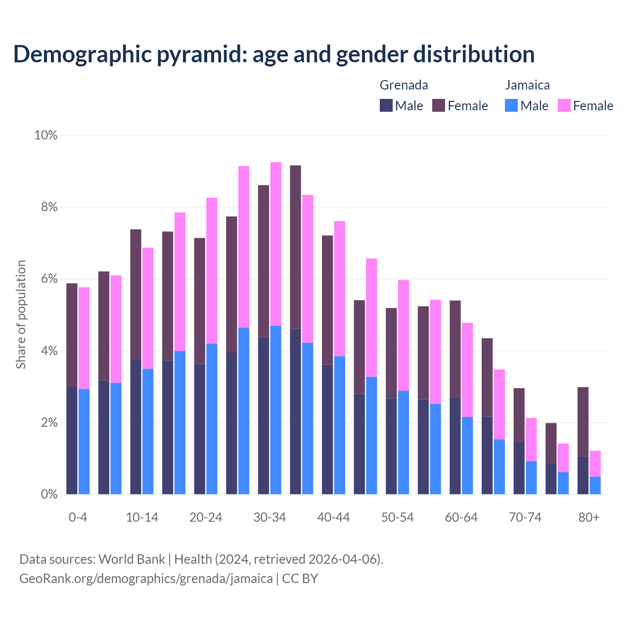 - Grenada is ranked 77/196 by median age (oldest to youngest) vs 87/196 for Jamaica.