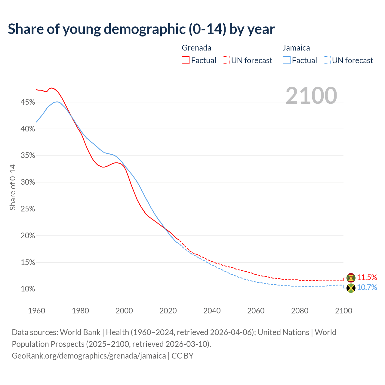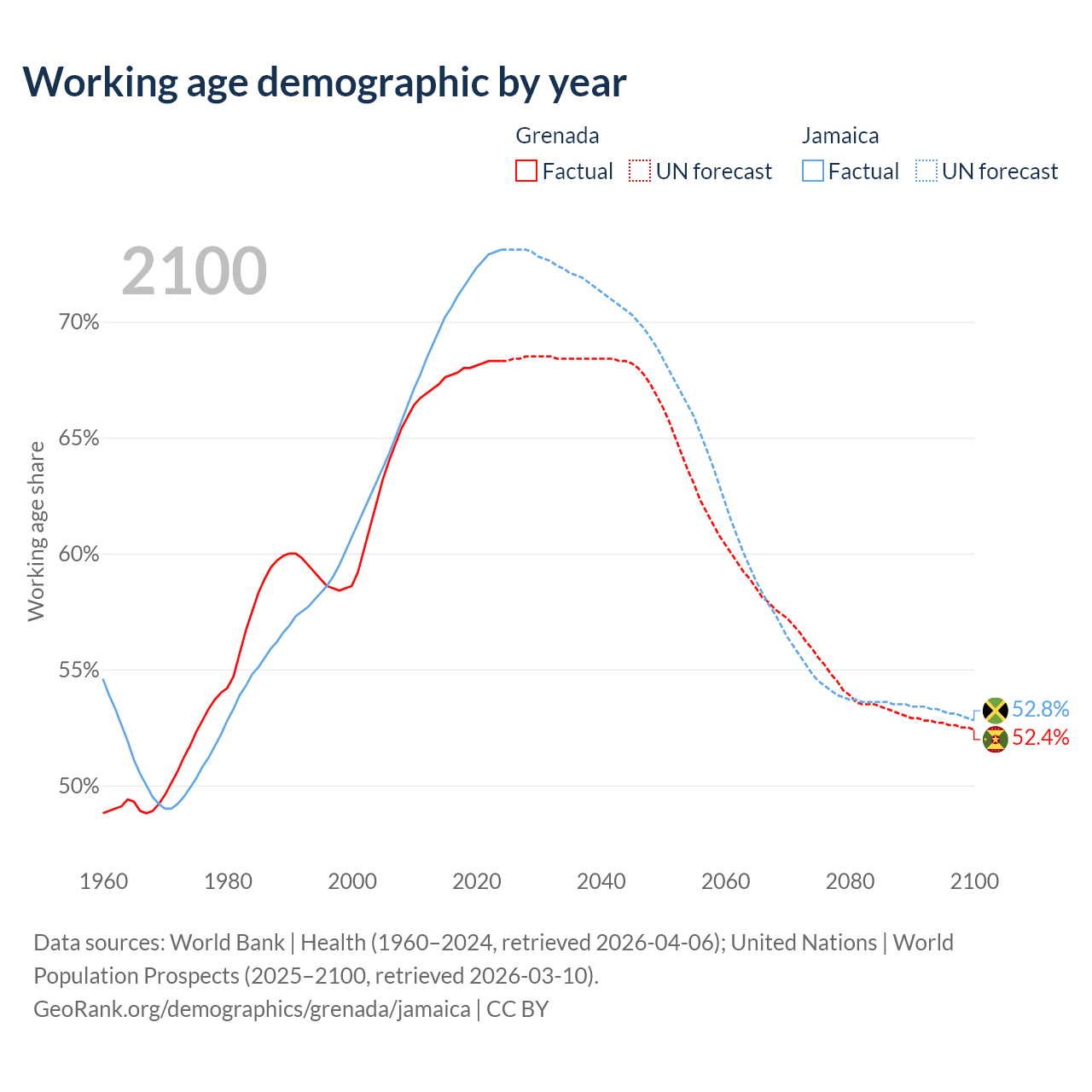 Median age Grenada vs Jamaica, 1960-2100