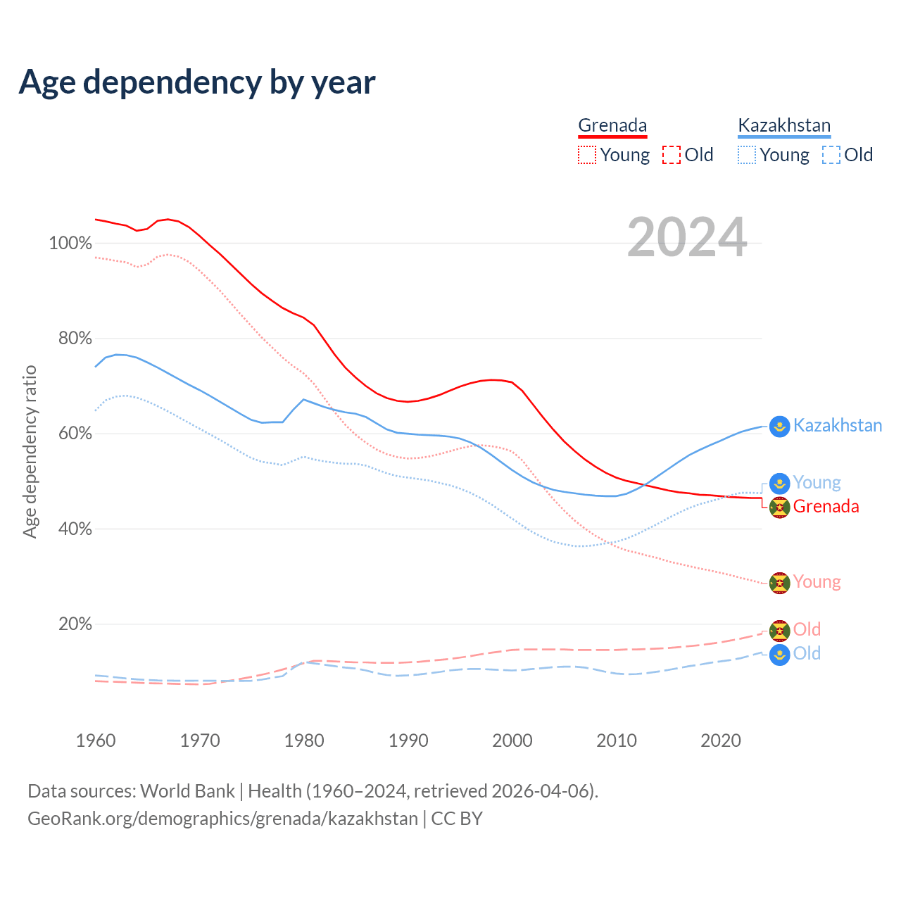 Data sources: World Bank | Health (1960–2024, retrieved 2026-04-06); U.S. Census Bureau (1960–2024, retrieved 2026-02-08).