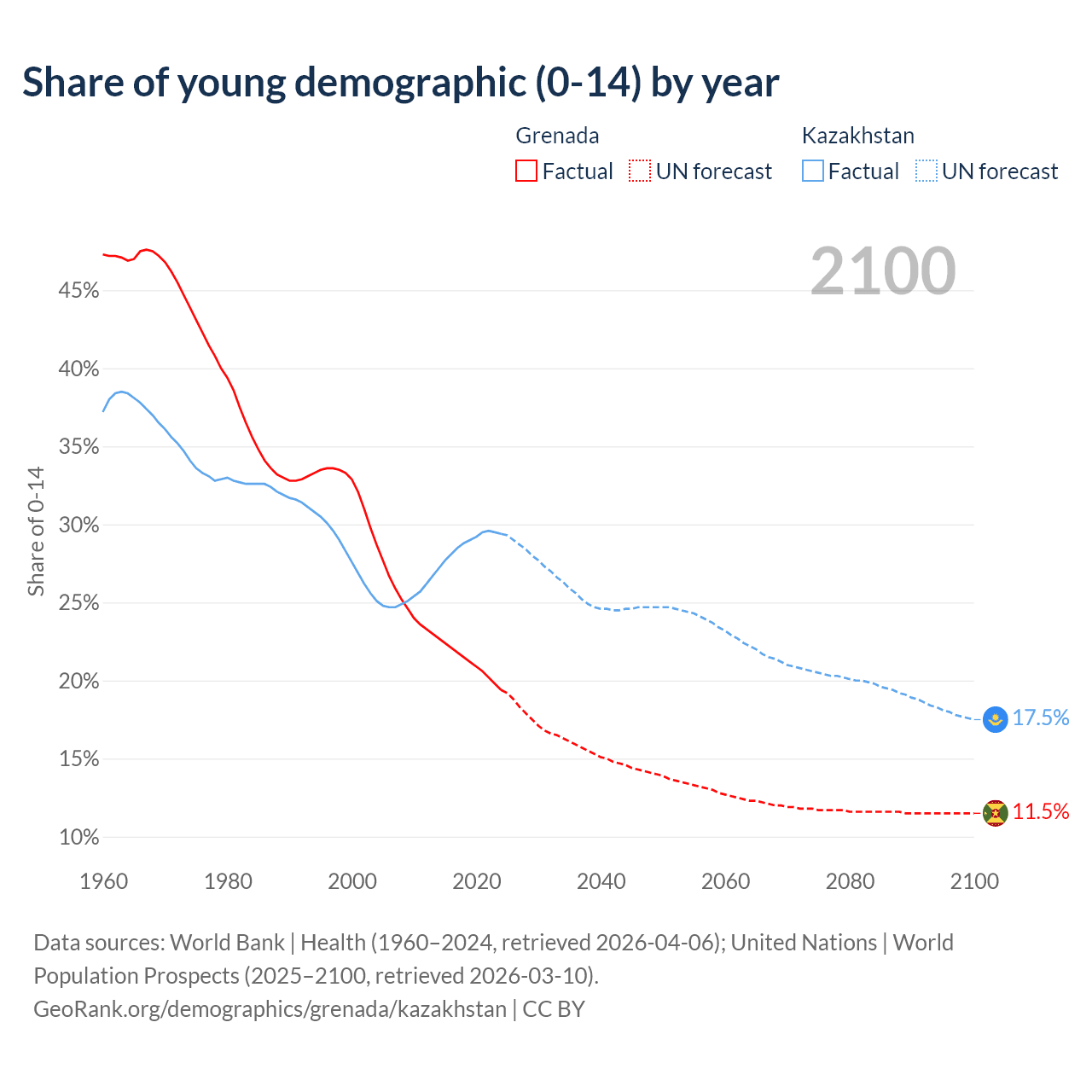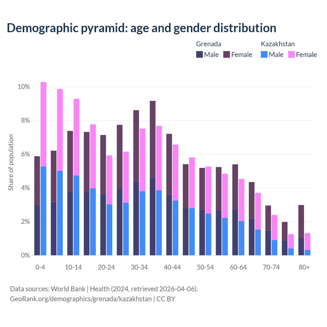 - The share of young demographic (0-15 years old) in Grenada is 19.4% vs 29.4% in Kazakhstan.