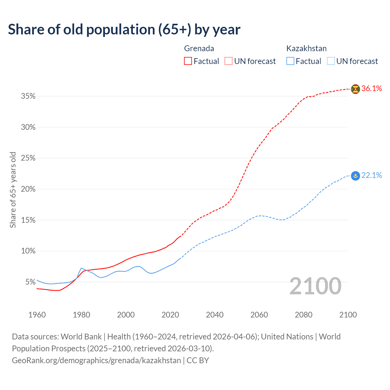 - The share of old-age demographic (65+) in Grenada is 12.2% vs 8.65% in Kazakhstan.