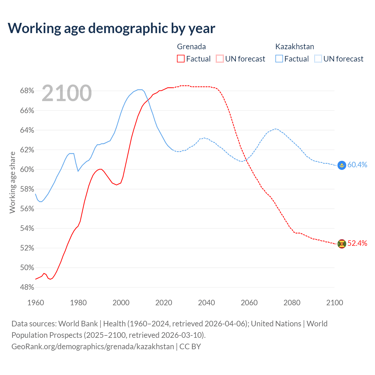 - Grenada has 80.2K working age adults (aged 15-64) vs 13.1M in Kazakhstan.