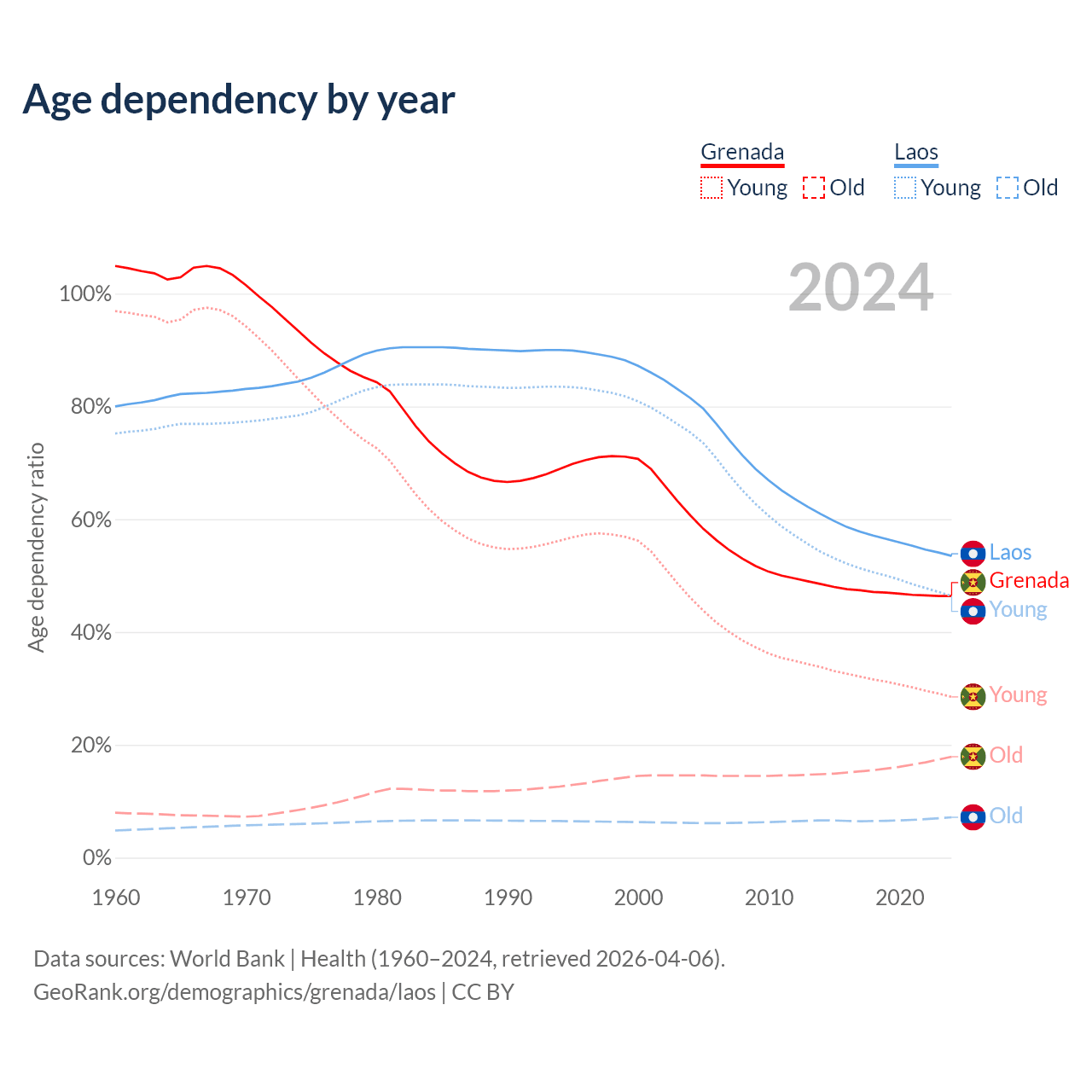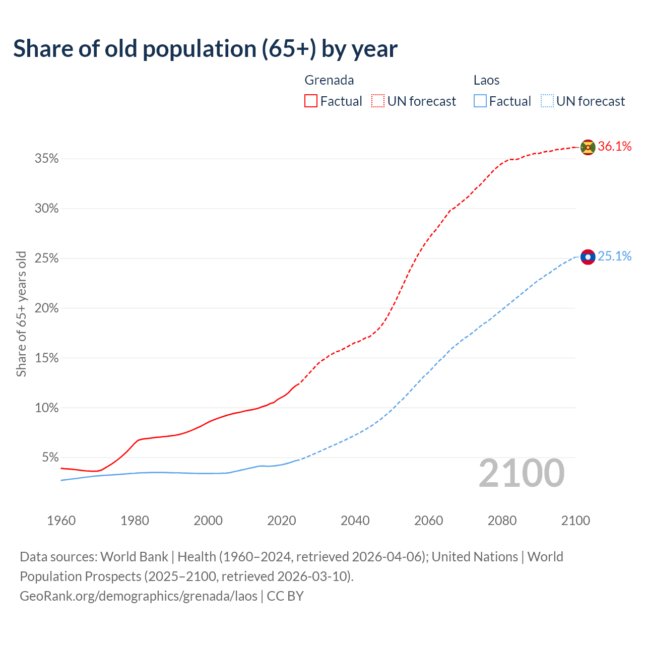 - The share of old-age demographic (65+) in Grenada is 12.2% vs 4.67% in Laos.