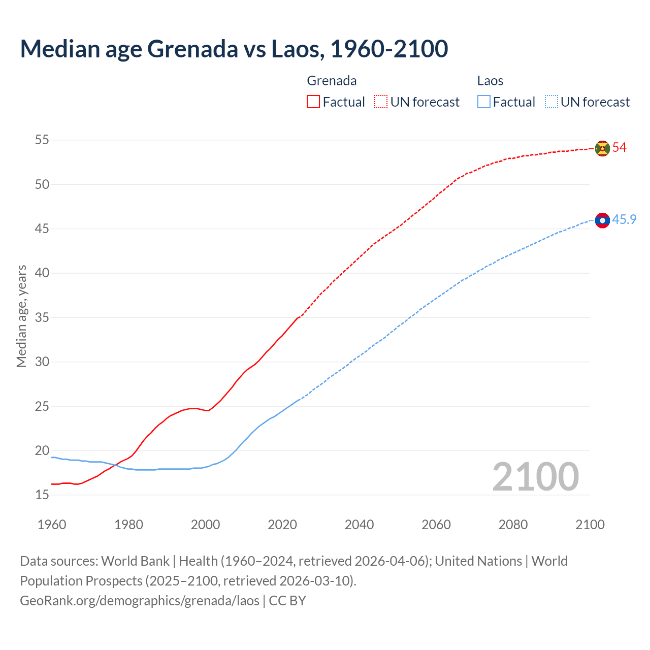 Median age Grenada vs Laos, 1960-2100