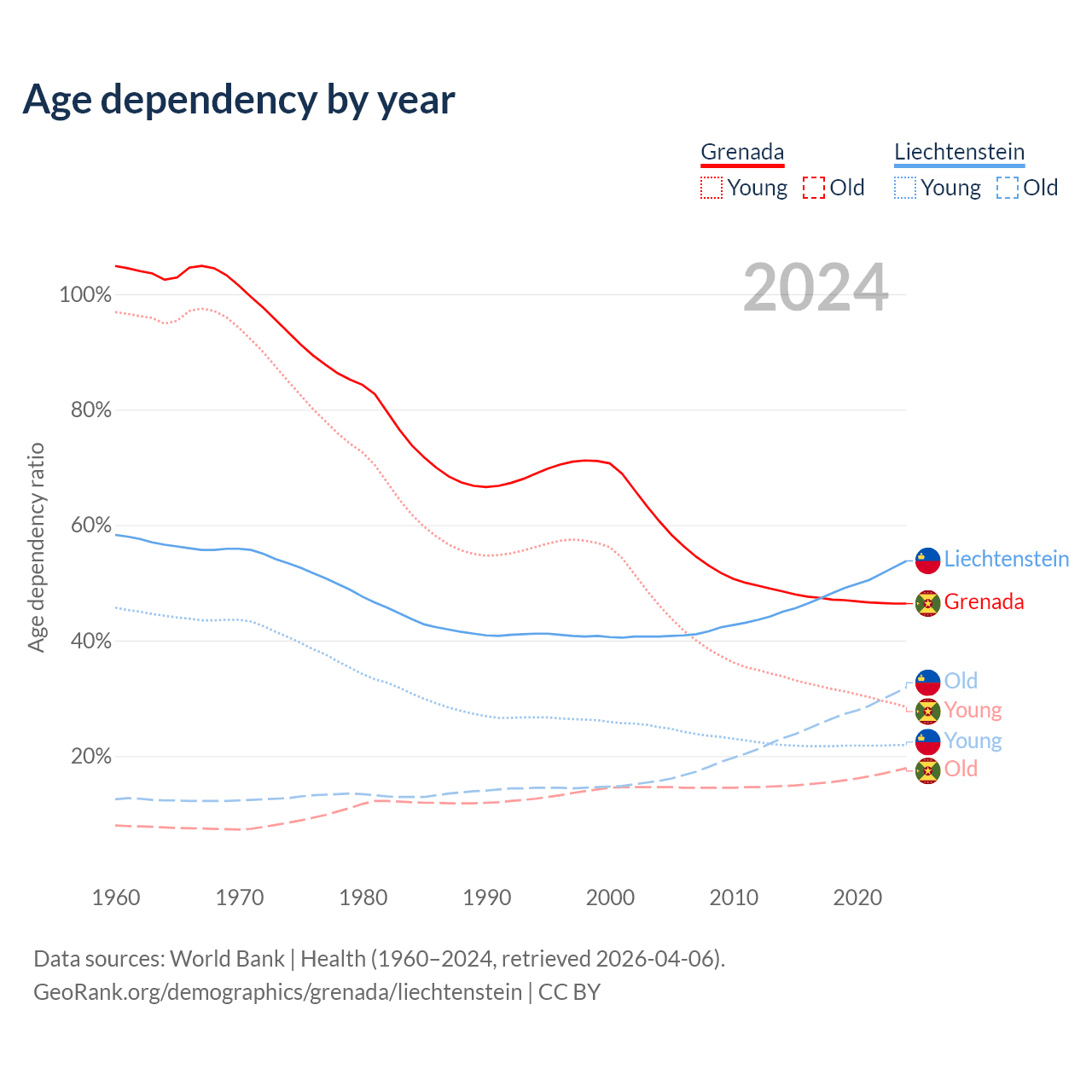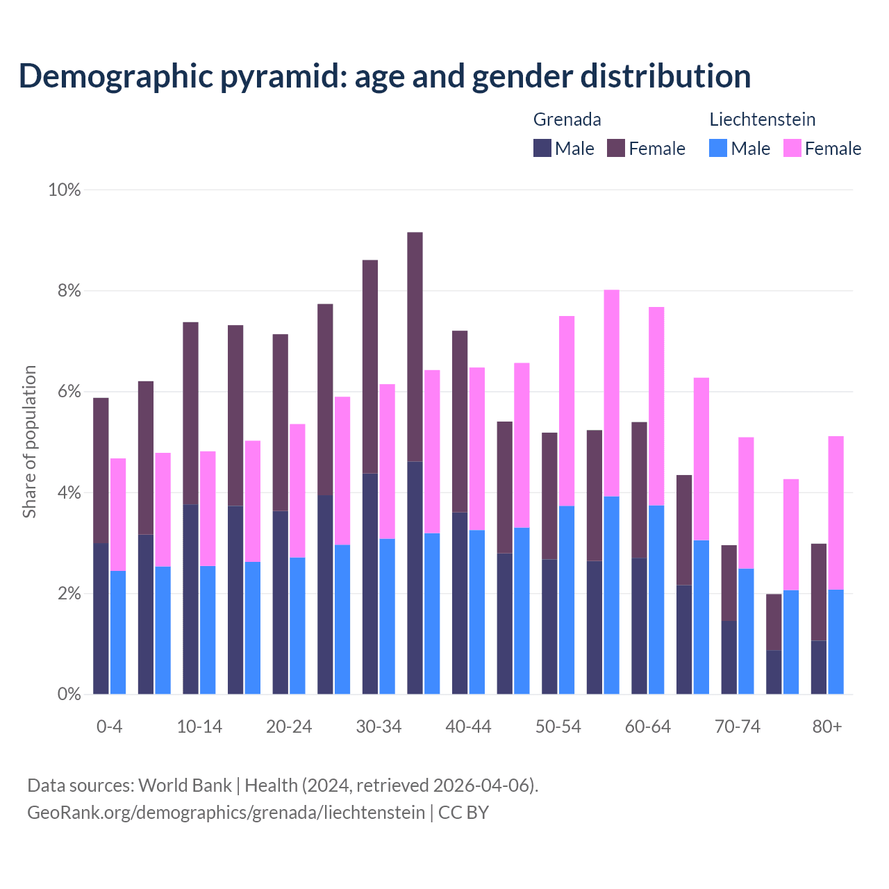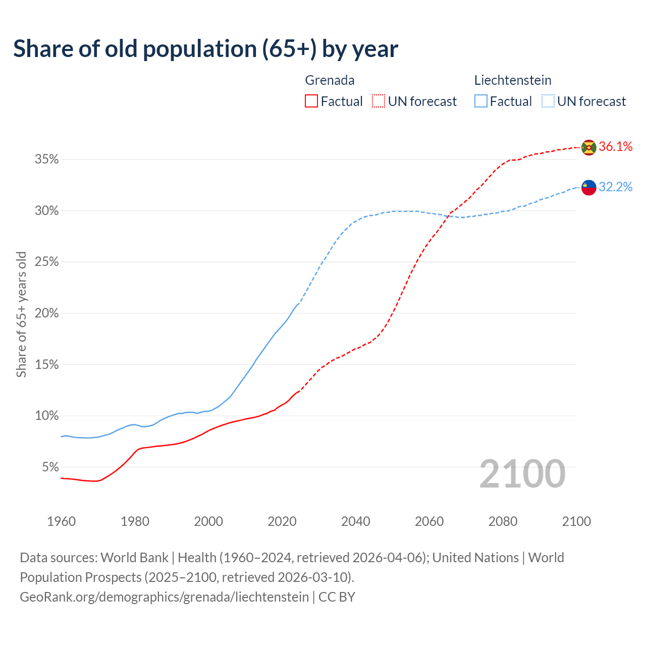 - The share of old-age demographic (65+) in Grenada is 12.2% vs 20.7% in Liechtenstein.
