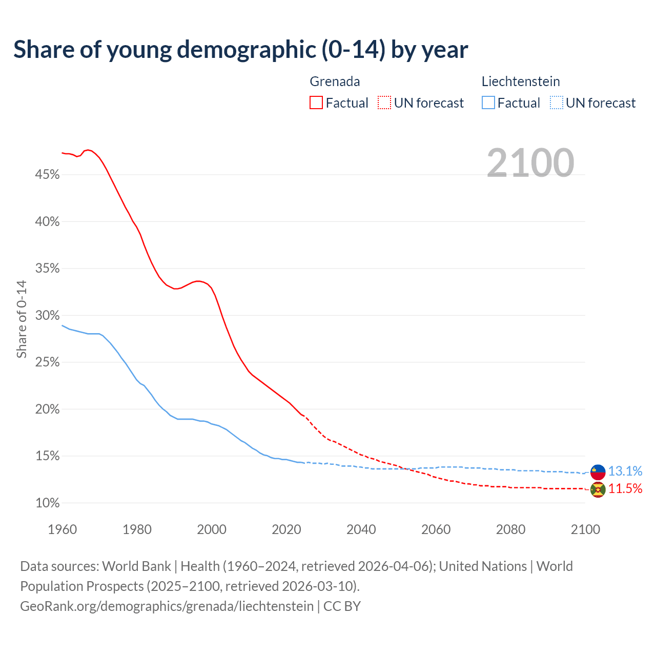 - The share of young demographic (0-15 years old) in Grenada is 19.4% vs 14.3% in Liechtenstein.