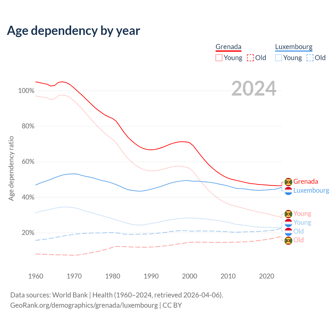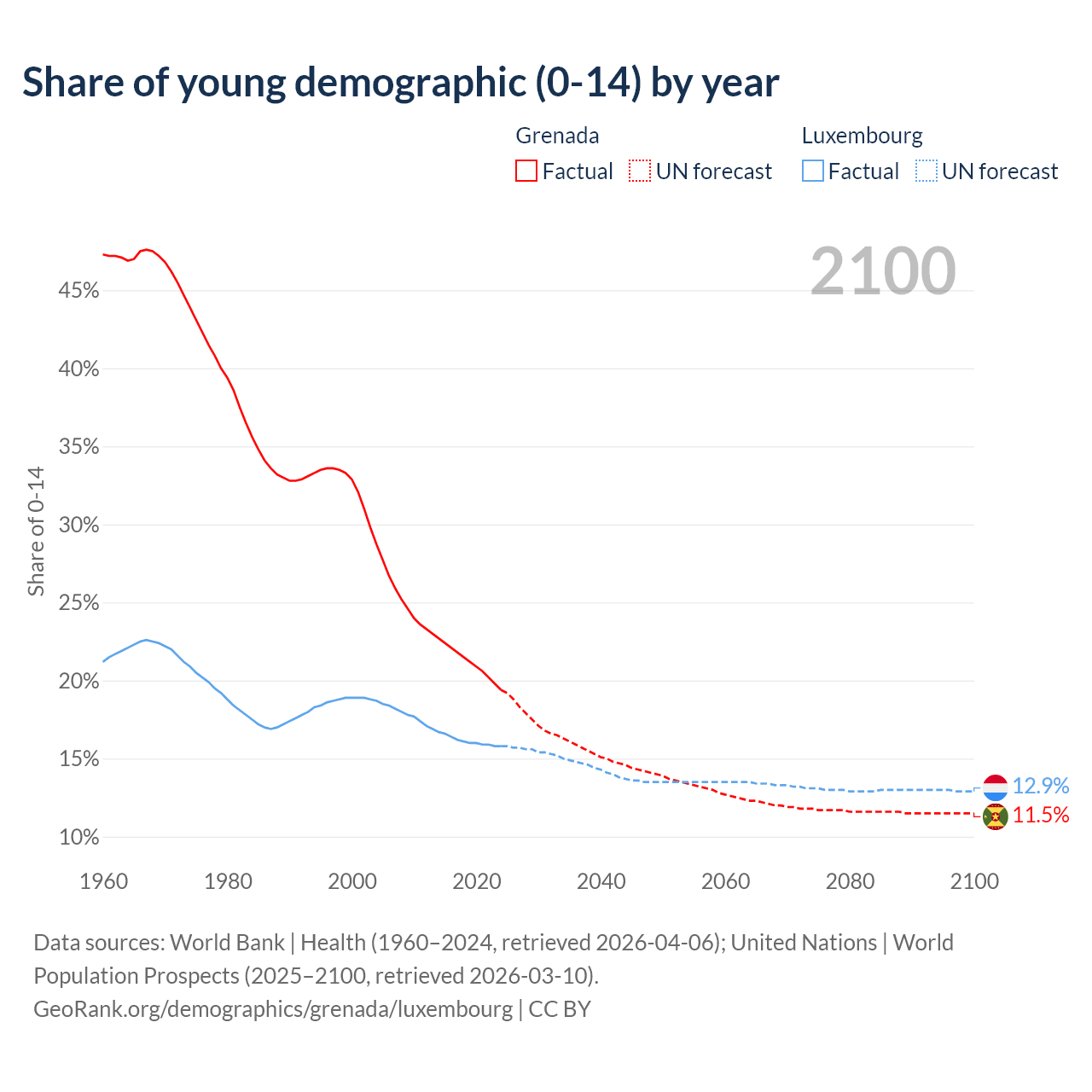- The share of young demographic (0-15 years old) in Grenada is 19.4% vs 15.8% in Luxembourg.