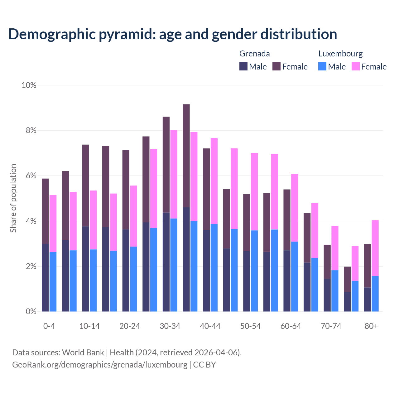 - The share of old-age demographic (65+) in Grenada is 12.2% vs 15.5% in Luxembourg.