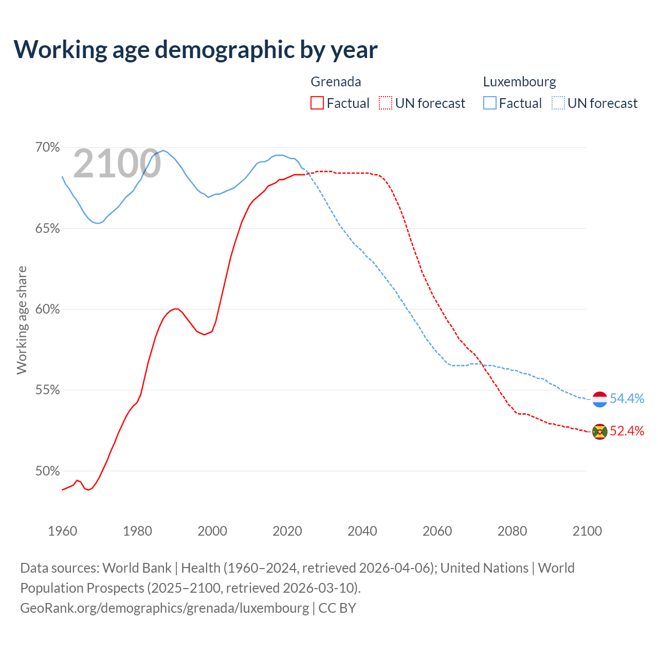 - Grenada has 80.2K working age adults (aged 15-64) vs 477K in Luxembourg.