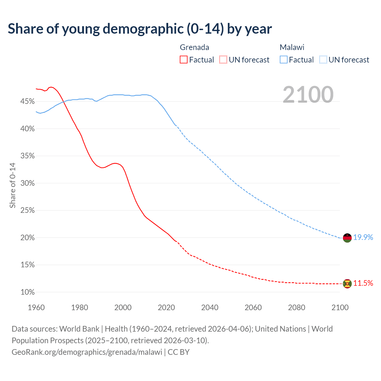 - The share of young demographic (0-15 years old) in Grenada is 19.4% vs 40.7% in Malawi.