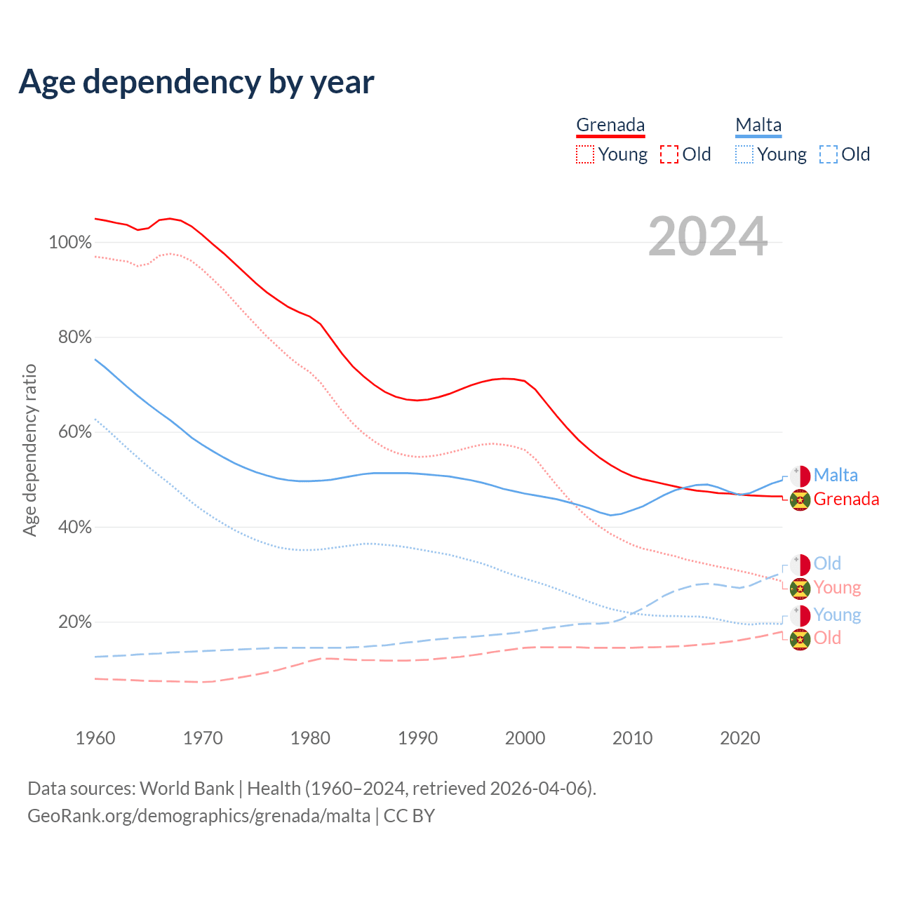- The share of old-age demographic (65+) in Grenada is 12.2% vs 20.2% in Malta.