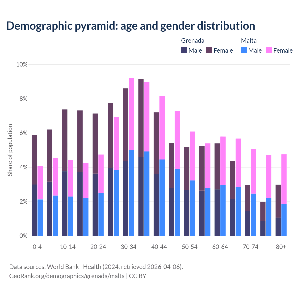 - Grenada is ranked 77/196 by median age (oldest to youngest) vs 36/196 for Malta.