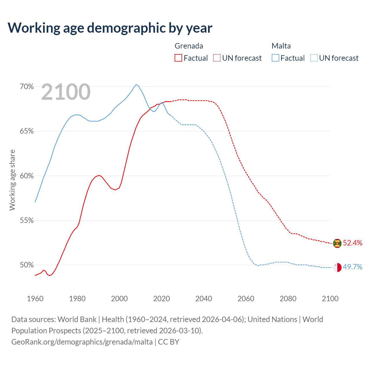 - Grenada has 80.2K working age adults (aged 15-64) vs 388K in Malta.