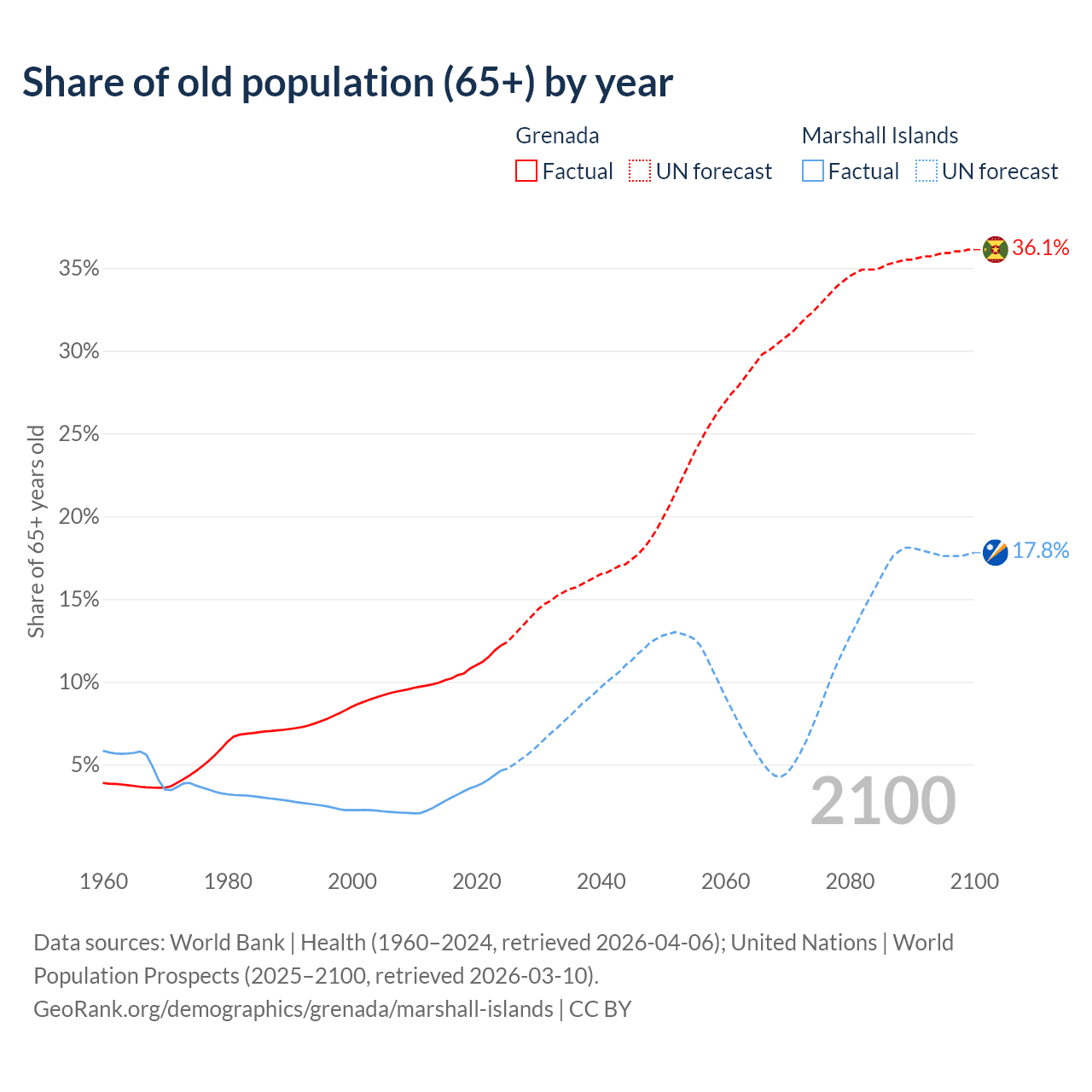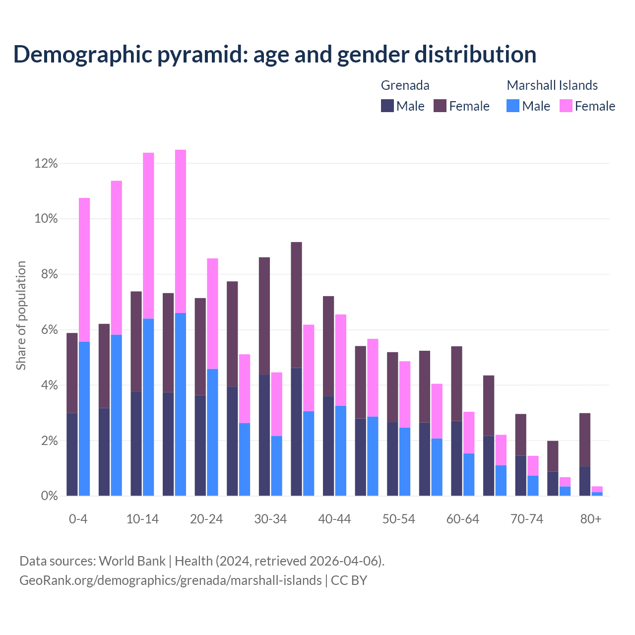 - The share of old-age demographic (65+) in Grenada is 12.2% vs 4.64% in the Marshall Islands.