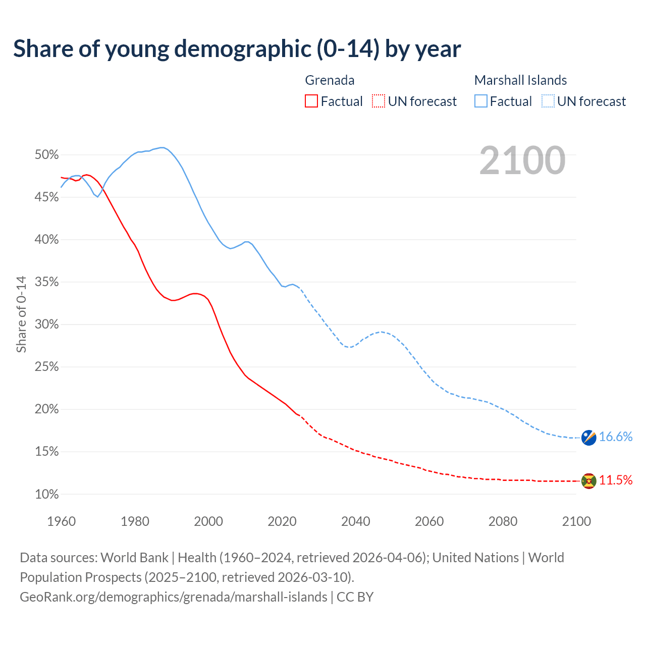 - The share of young demographic (0-15 years old) in Grenada is 19.4% vs 34.5% in the Marshall Islands.