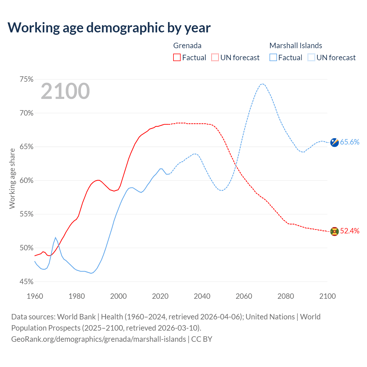 - Grenada has 80.2K working age adults (aged 15-64) vs 21.3K in the Marshall Islands.