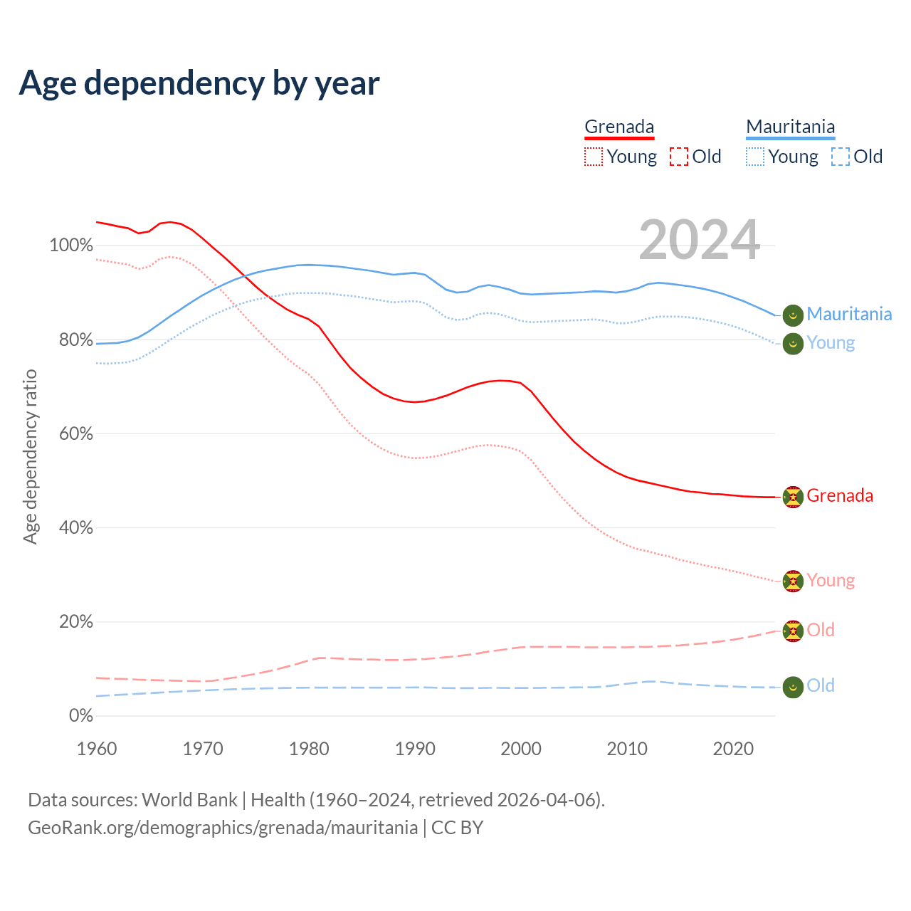 - The share of young demographic (0-15 years old) in Grenada is 19.4% vs 42.7% in Mauritania.