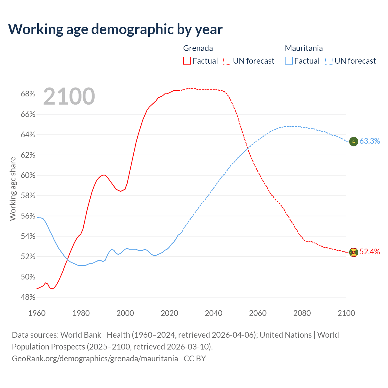 - Grenada has 80.2K working age adults (aged 15-64) vs 2.98M in Mauritania.