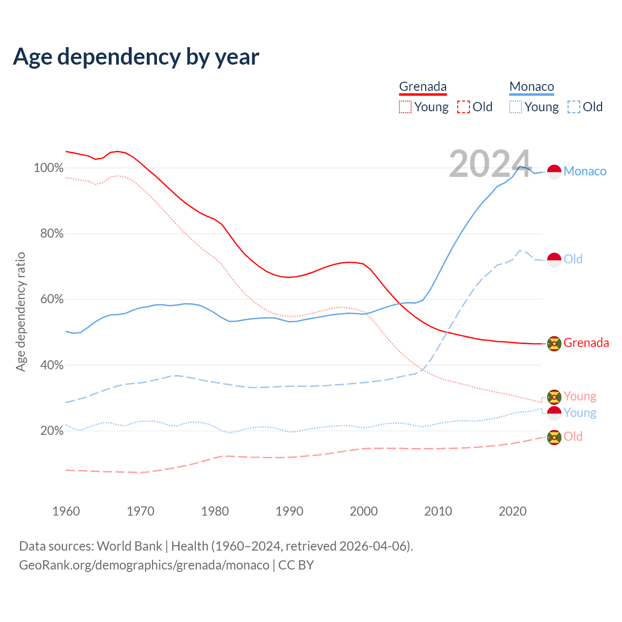 - Grenada is ranked 77/196 by median age (oldest to youngest) vs 1/196 for Monaco.