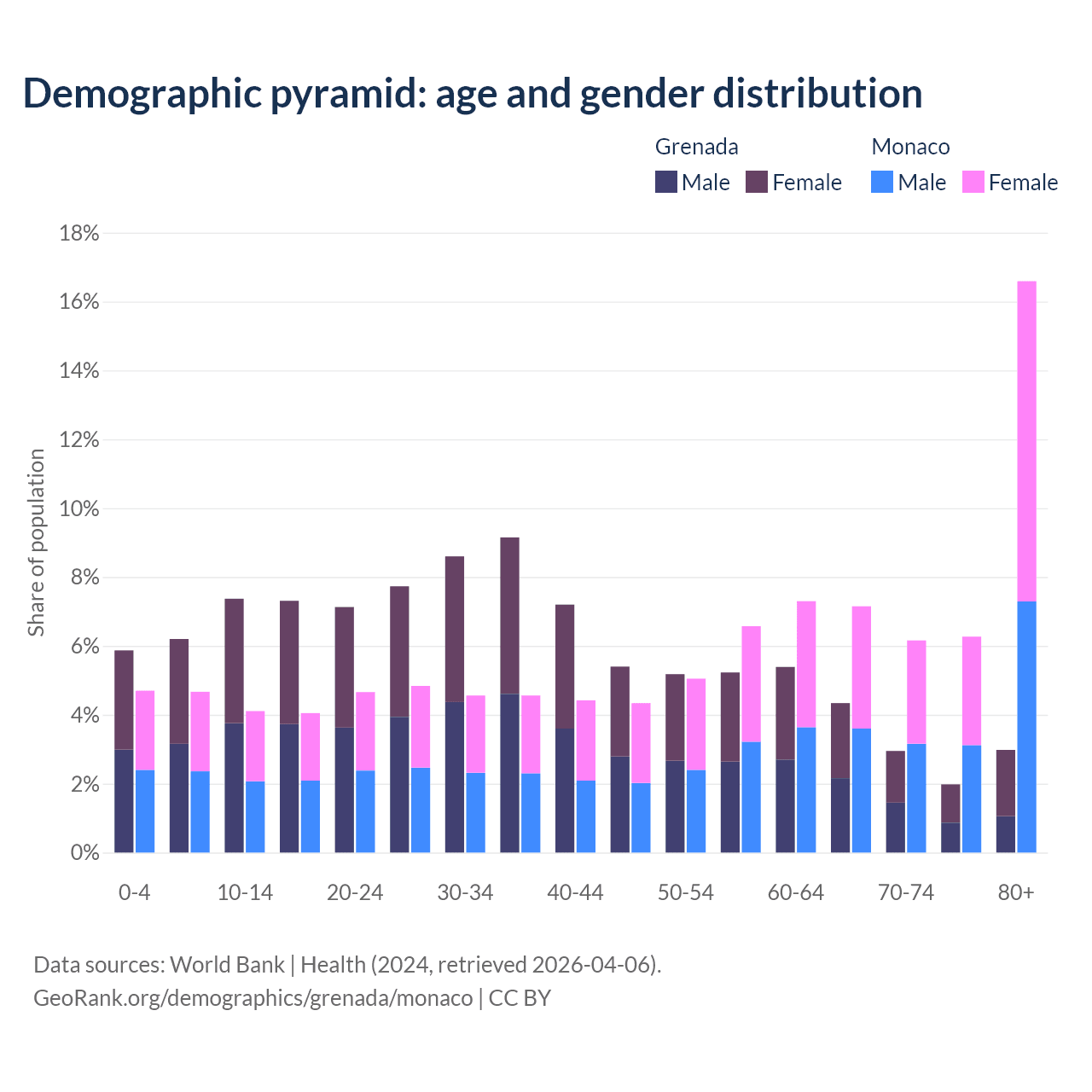 - The share of old-age demographic (65+) in Grenada is 12.2% vs 36.2% in Monaco.