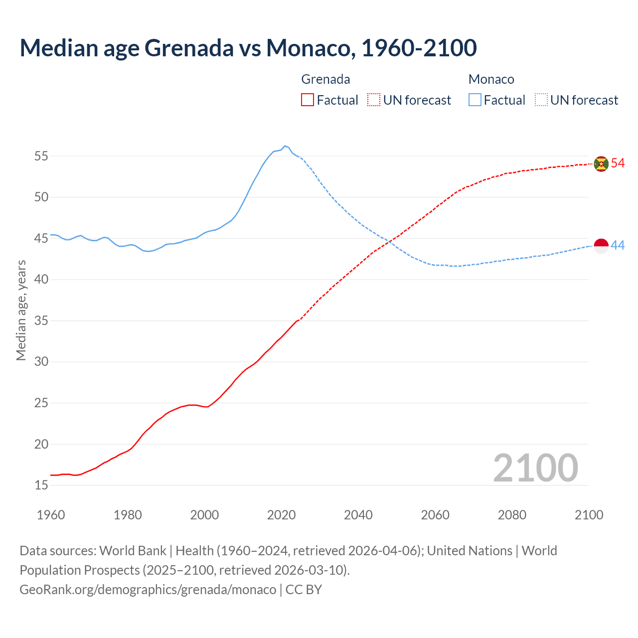 Median age Grenada vs Monaco, 1960-2100